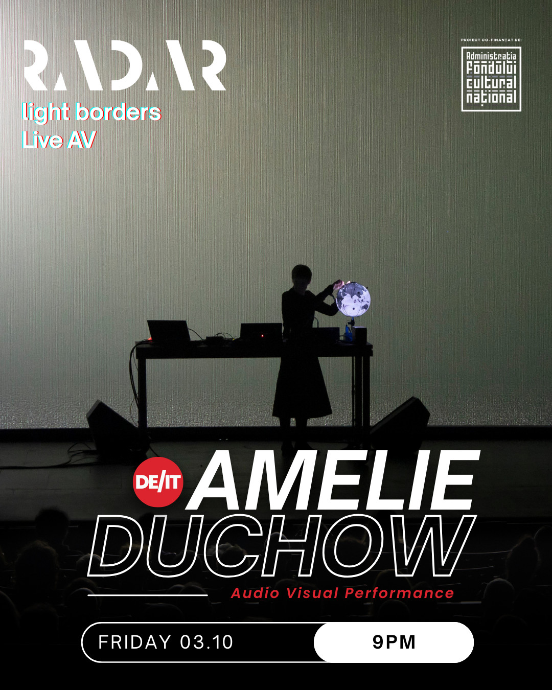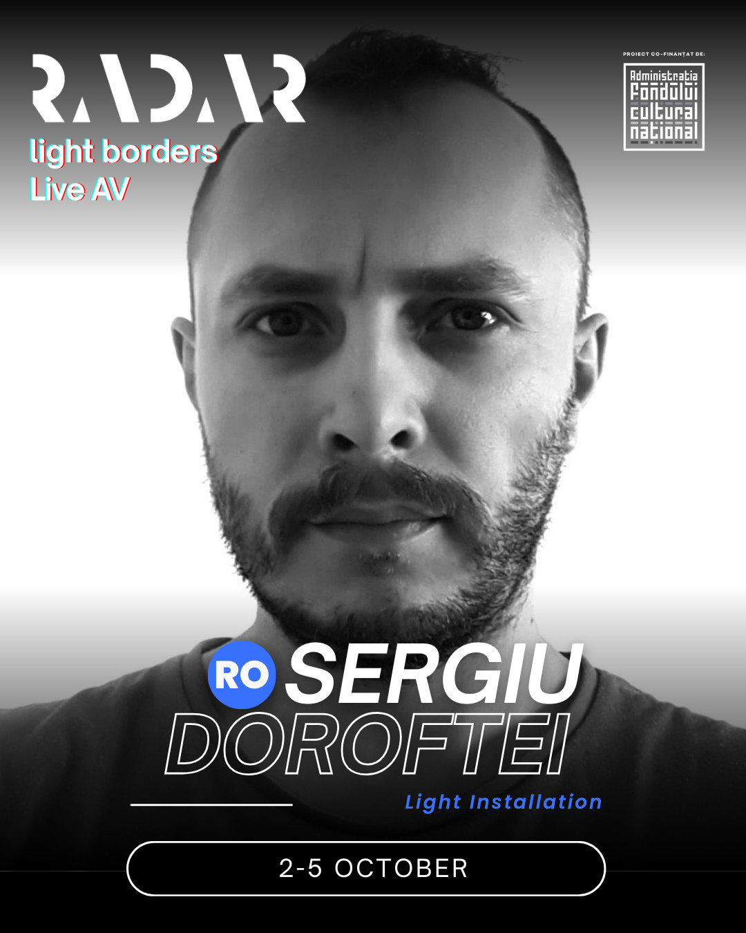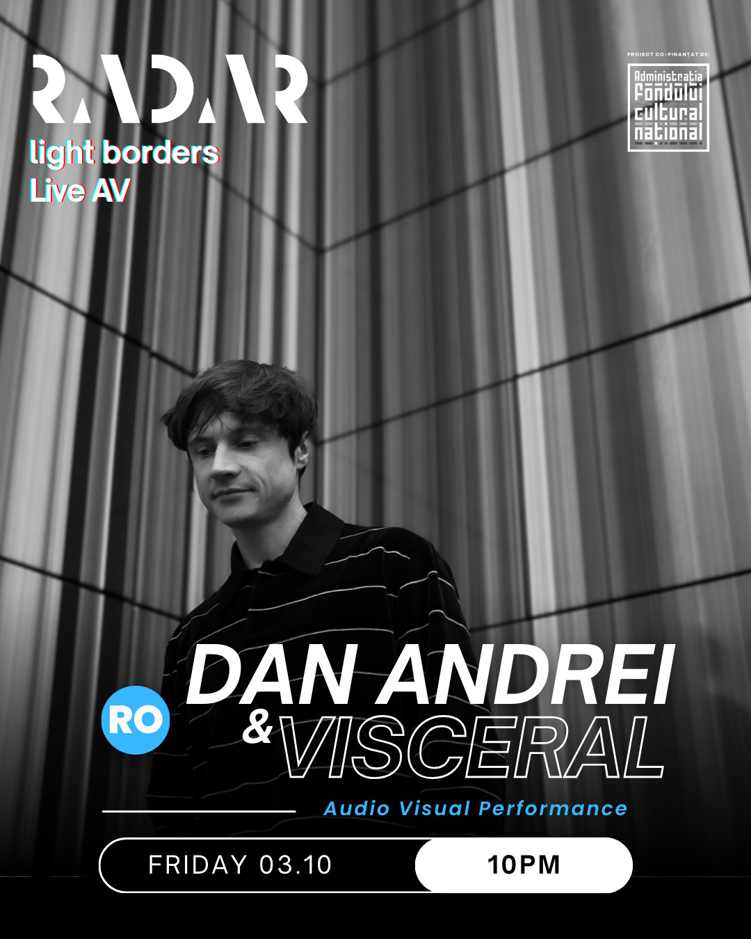 Scena Audio-Vizuală a festivalului RADAR, cu tema Light Borders, aduce în fața publicului unele dintre cele mai inovatoare performance-uri live de muzică electronică și artă vizuală. Această secțiune a festivalului completează programul general RADAR, eveniment în cadrul căruia expun artiști din 11 țări, confirmând poziția festivalului ca platformă internațională a noilor media și a experimentului artistic. Festivalul va avea loc în Sala de Marmură, Casa Presei Libere.