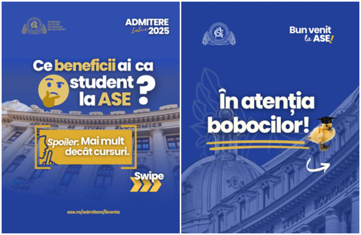 Două coperți ale unor carusele realizate pentru ASE: primul, din perioada de admitere, a vizat etapa de consideration, cu accent pe beneficii; al doilea, din perioada începutului de an universitar, a oferit continuate campaniei prin mesaje de integrare și apartenență, adresate bobocilor.