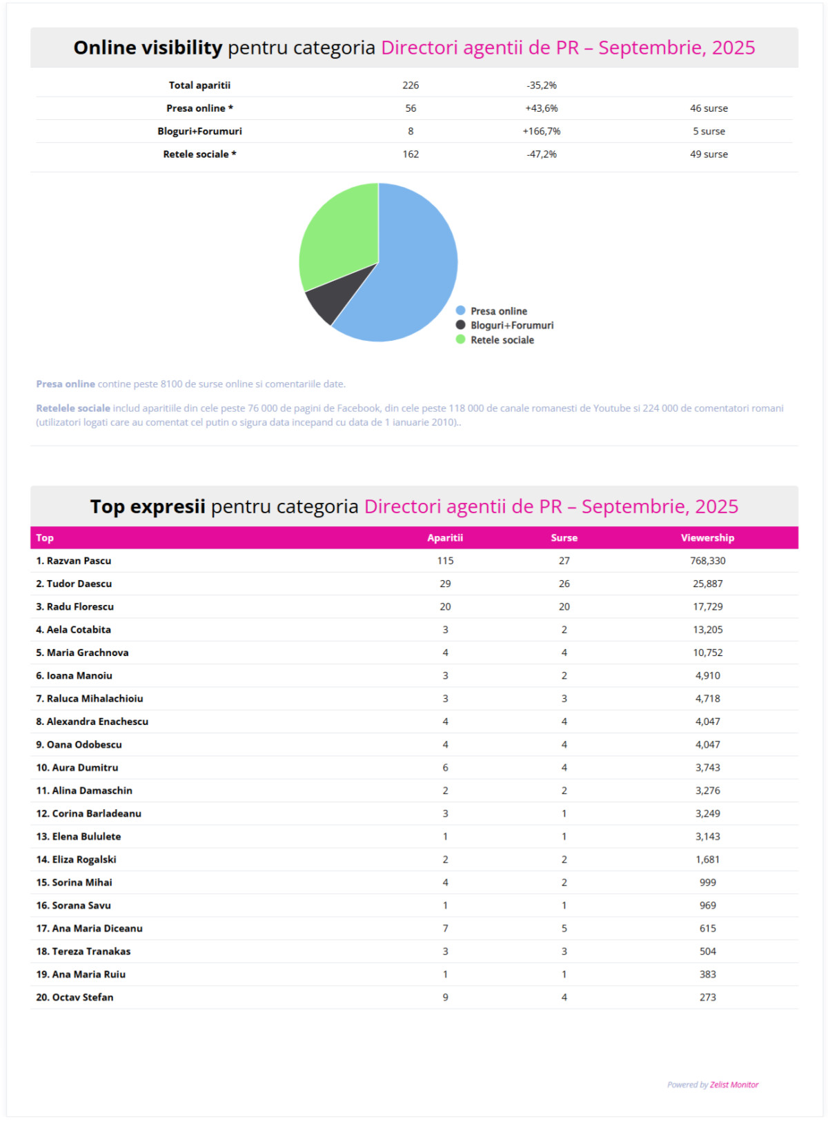 In topul celor mai vizibili directori ai agentiilor de PR in online si pe Facebook din septembrie efectuat de ZeList si publicat lunar de IQads, Razvan Pascu ocupa locul intai (768,330 de views) si pe locul al doilea se afla Tudor Daescu (25,887 de views). Radu Florescu (17,729 viewership) se afla pe locul al treilea.