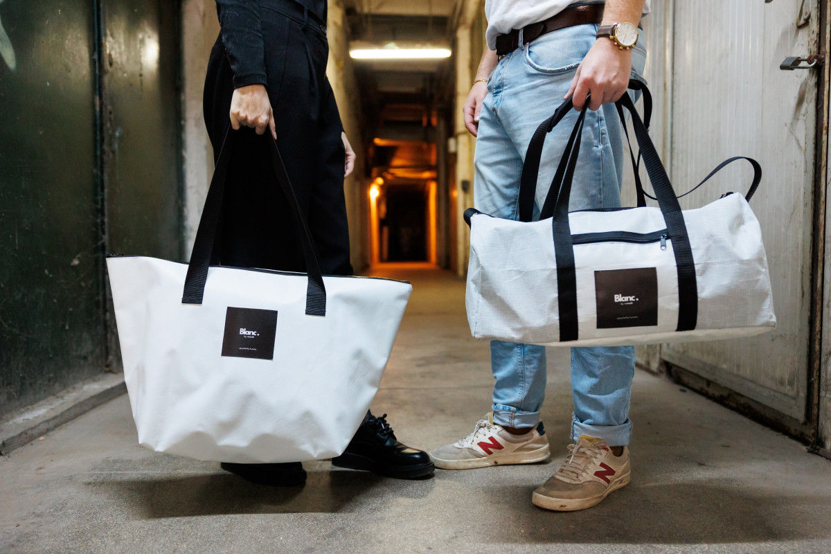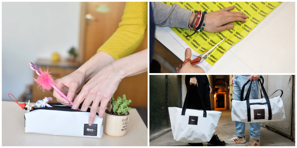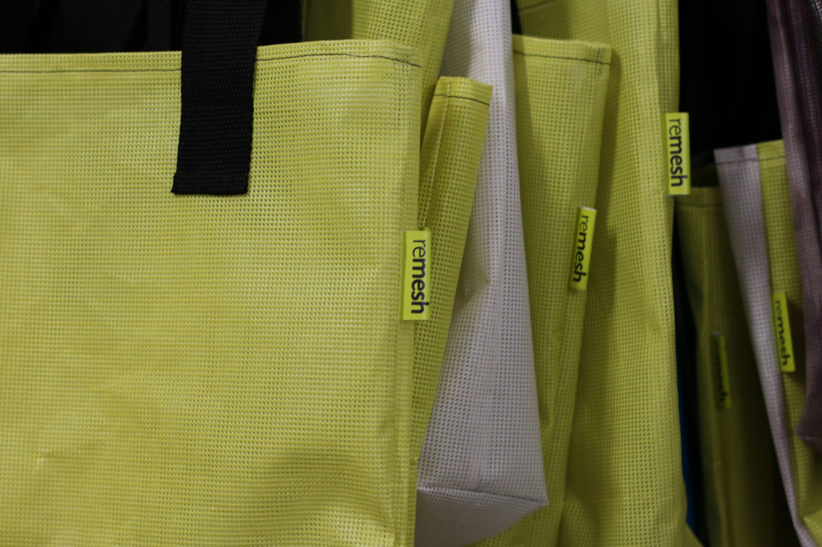Procesul seamănă mult cu cel dintr-un atelier de marochinărie, doar că materia primă este atipică. Mai întâi verificăm bannerul – îl curățăm, îl spălăm, îl croim și apoi îl coasem cu atenție.