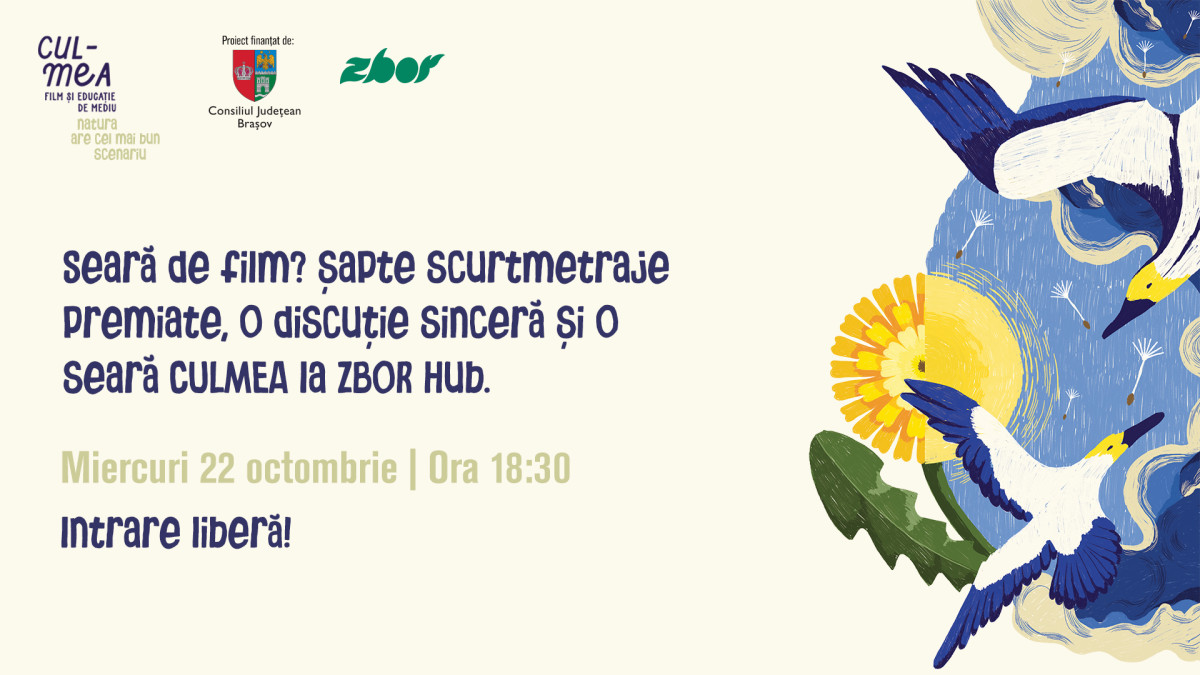Pentru studenți festivalul propune miercuri, 22 octombrie, de la ora 18:30 la 20:30, un eveniment CULMEA cu intrare liberă la ZBOR Hub, în care vor rula șapte scurtmetraje profunde, neliniștitoare și inteligente despre criza climatică și toate crizele umanitare asociate. Pentru că locurile sunt limitate, accesul se va face pe bază de rezervare prin acest formular. Dat fiind că scurtmetrajele ajung foarte rar în cinematografe sau în cadrul programelor TV această proiecție este un eveniment de neratat, în care studenții pot descoperi universuri creative noi.