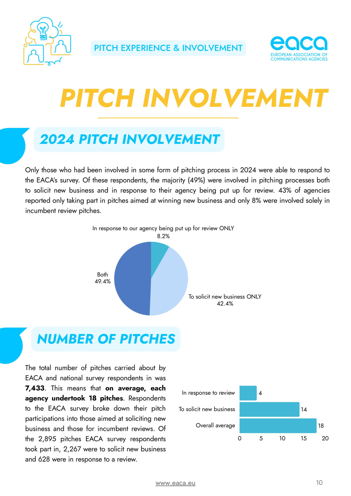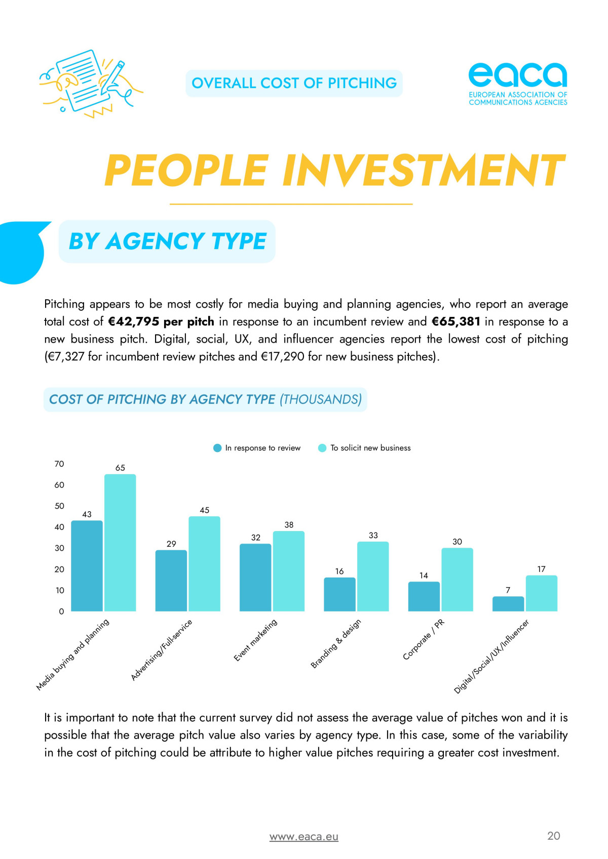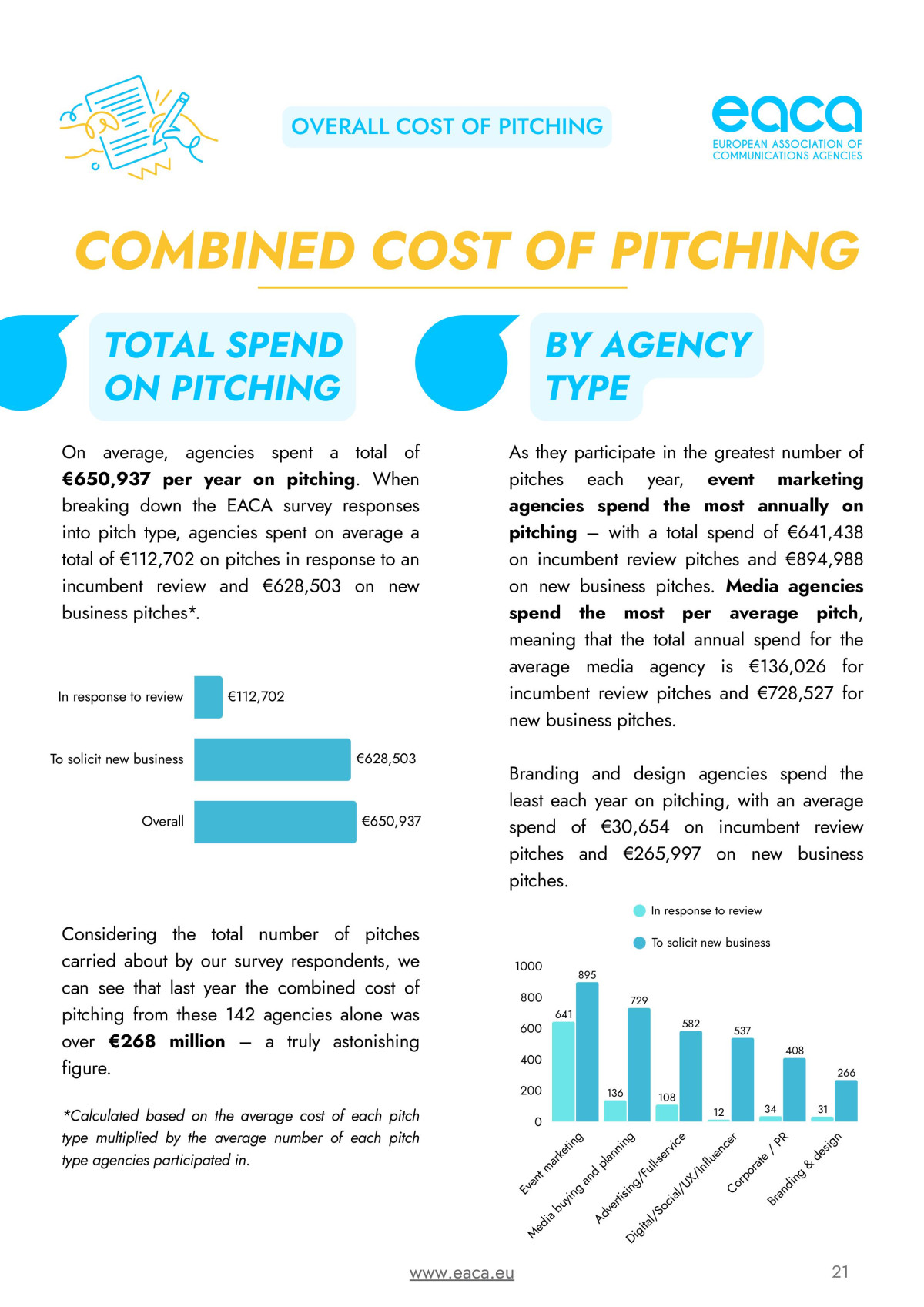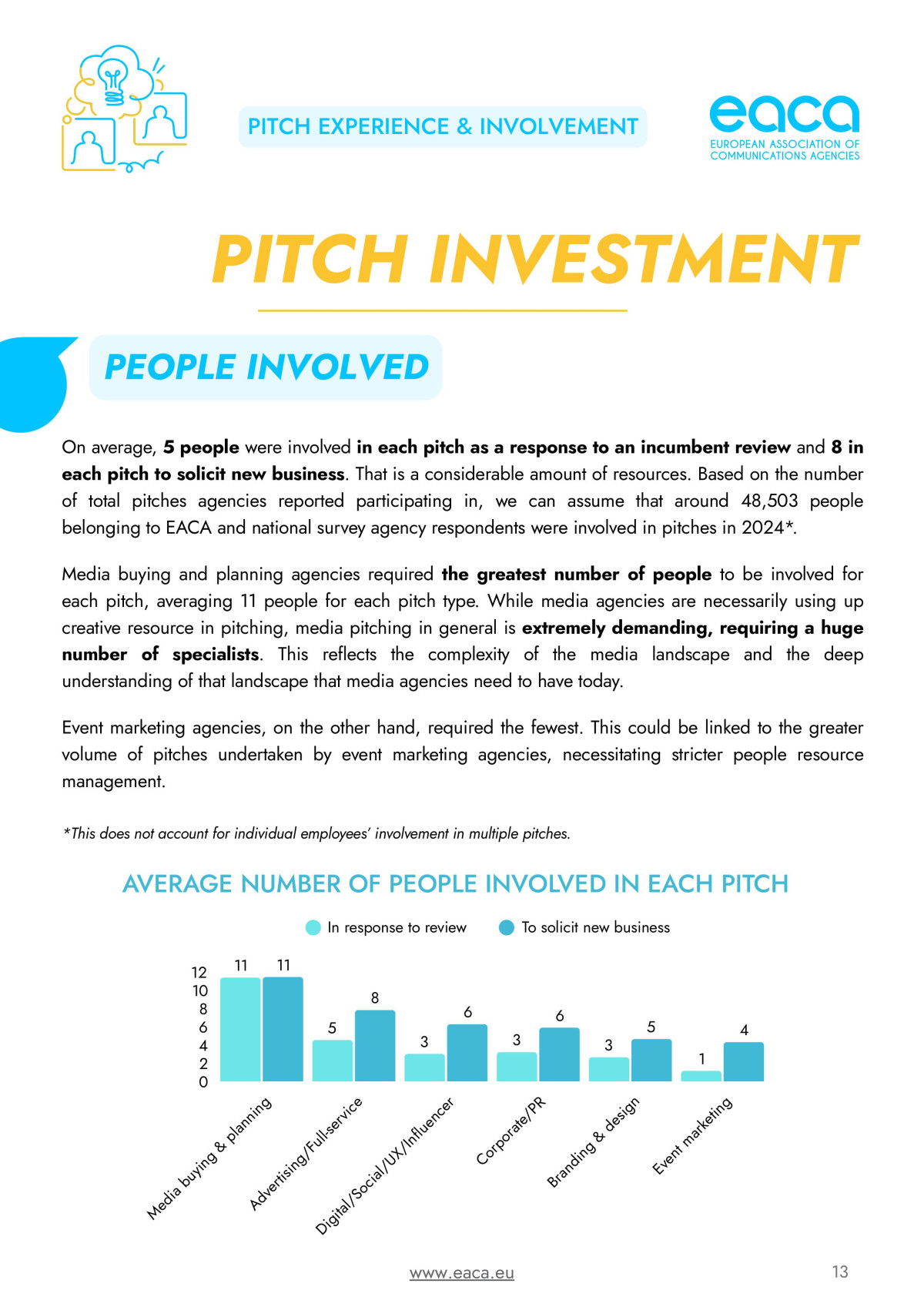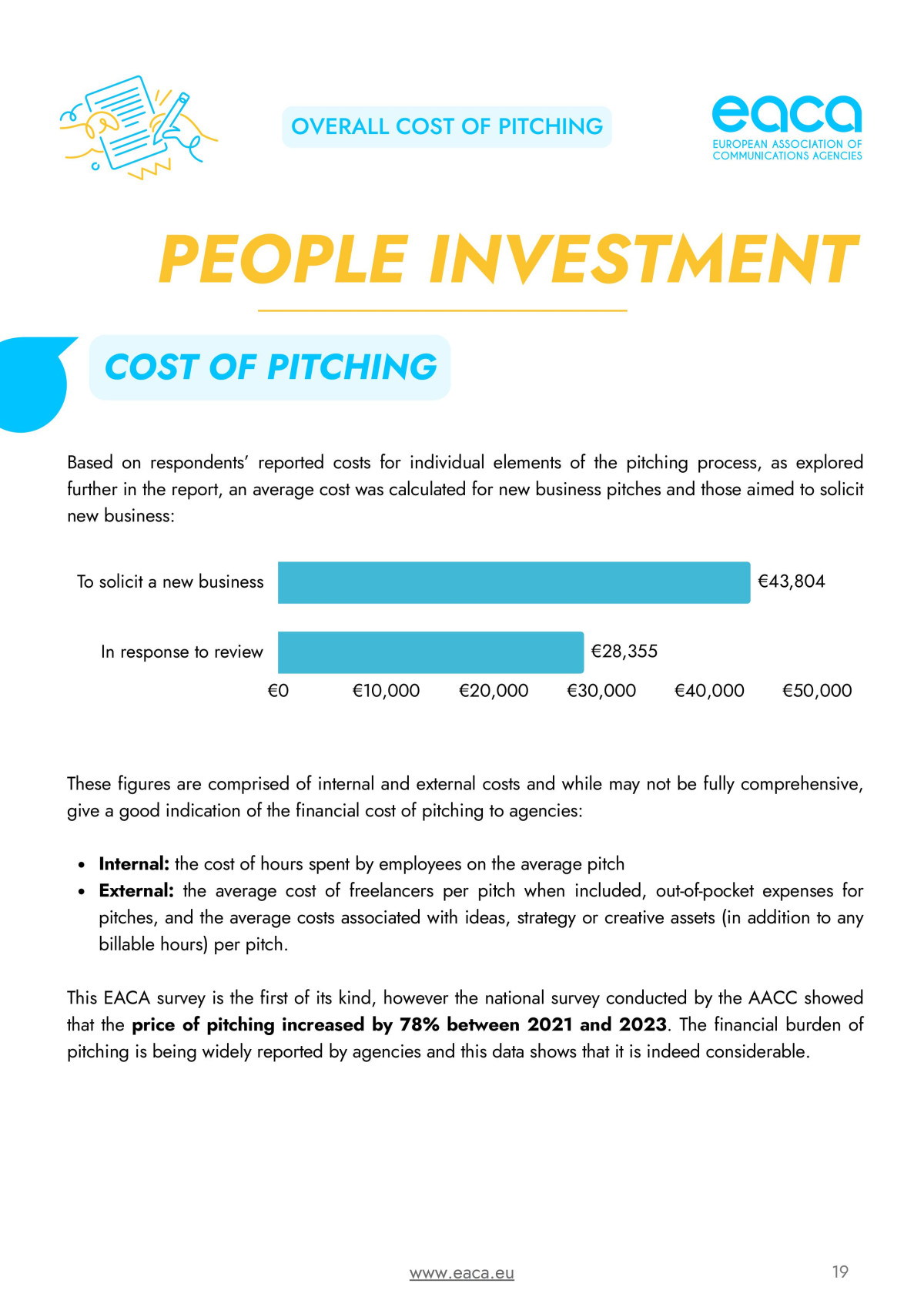 Agențiile europene cheltuie în medie 650.000 € anual pentru participarea la pitch-uri. Un pitch de new business implică și la nivelul agențiilor europene, în medie 8 persoane, fiecare alocând aproximativ 48 de ore pentru pregătirea pitch-ului. La nivel European, doar 42% dintre propunerile creative câștigătoare sunt implementate efectiv.