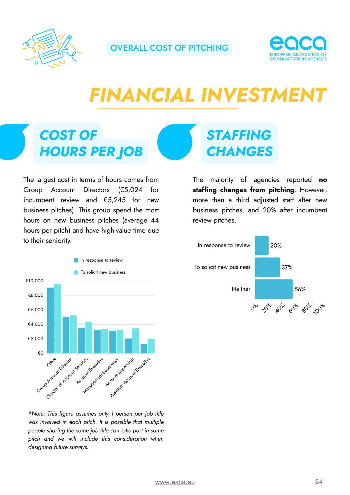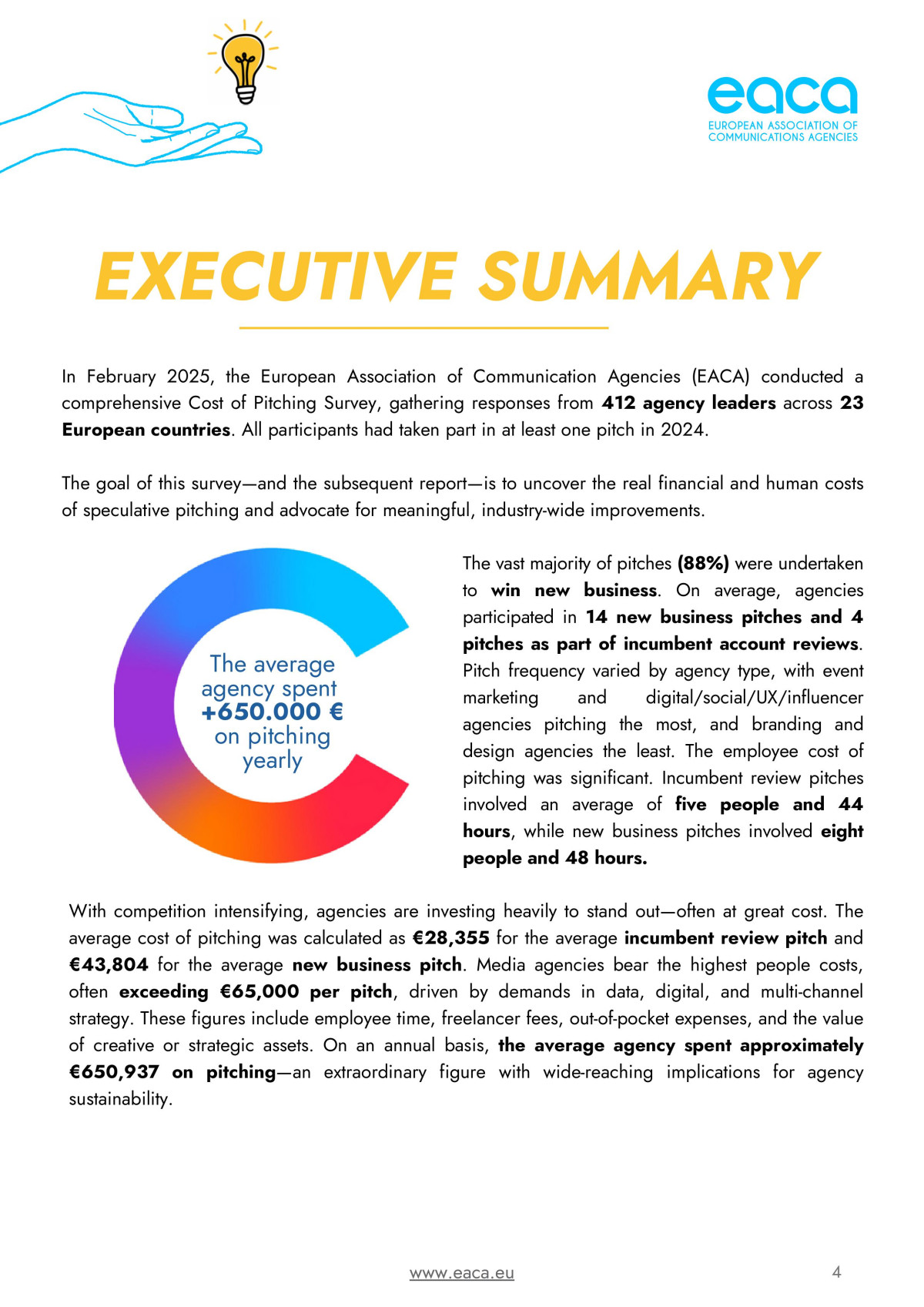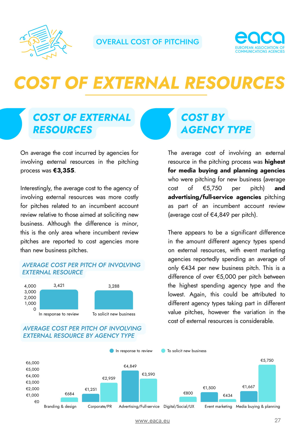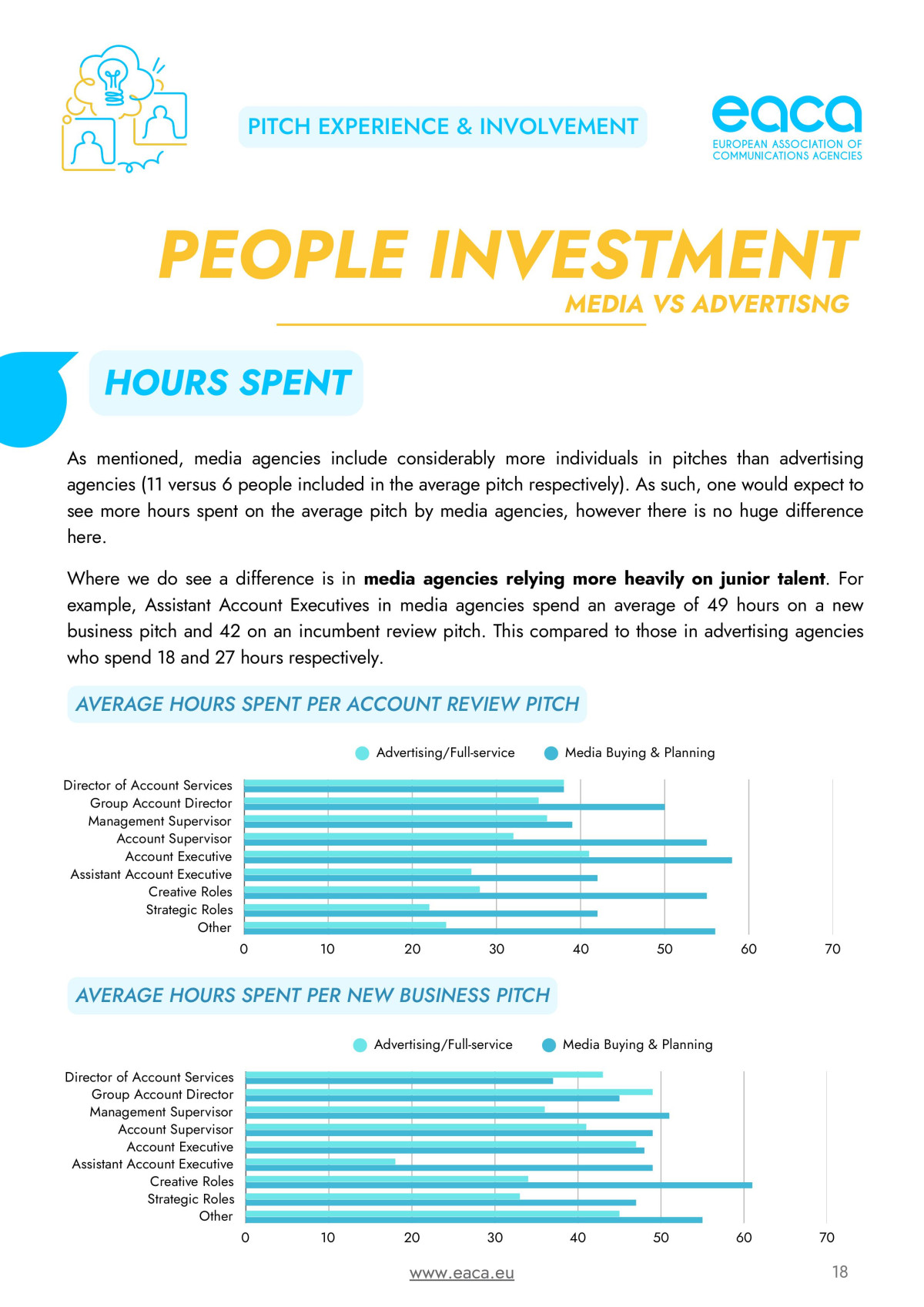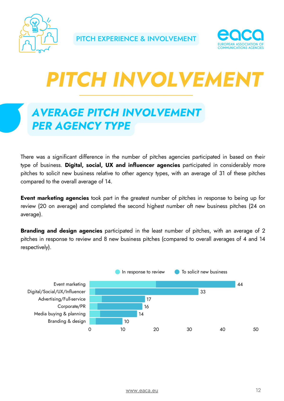 Agențiile europene cheltuie în medie 650.000 € anual pentru participarea la pitch-uri. Un pitch de new business implică și la nivelul agențiilor europene, în medie 8 persoane, fiecare alocând aproximativ 48 de ore pentru pregătirea pitch-ului. La nivel European, doar 42% dintre propunerile creative câștigătoare sunt implementate efectiv.