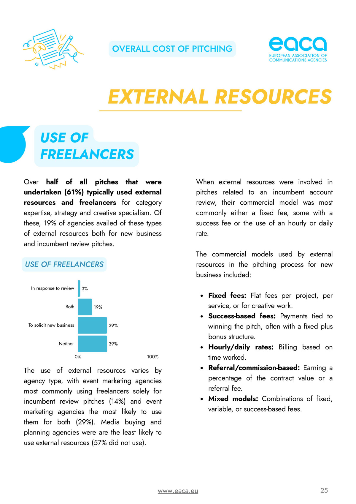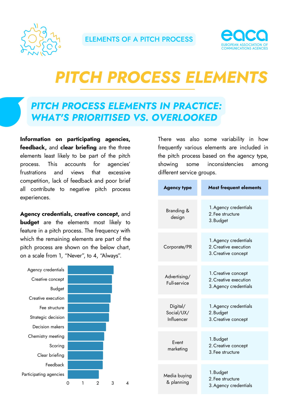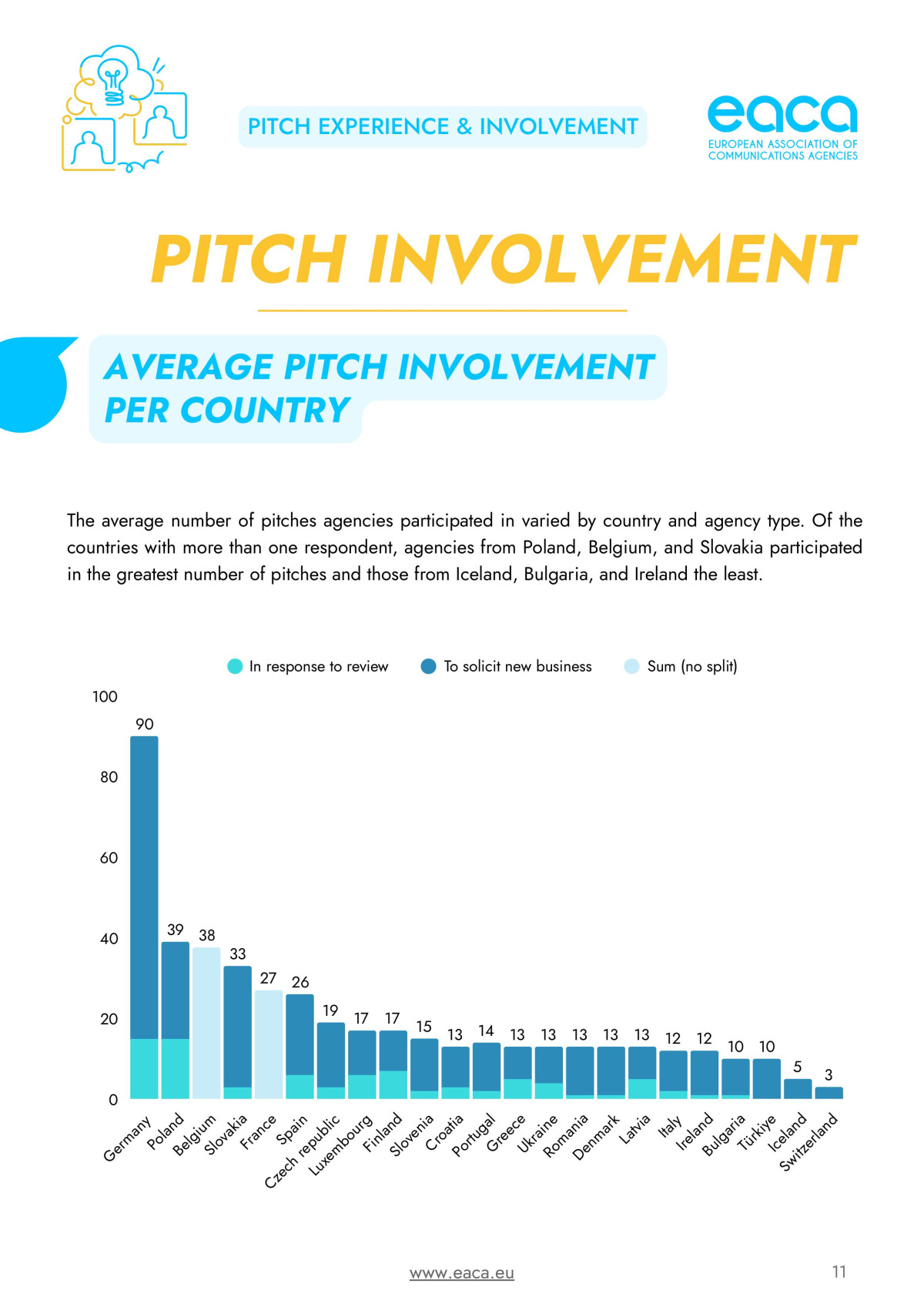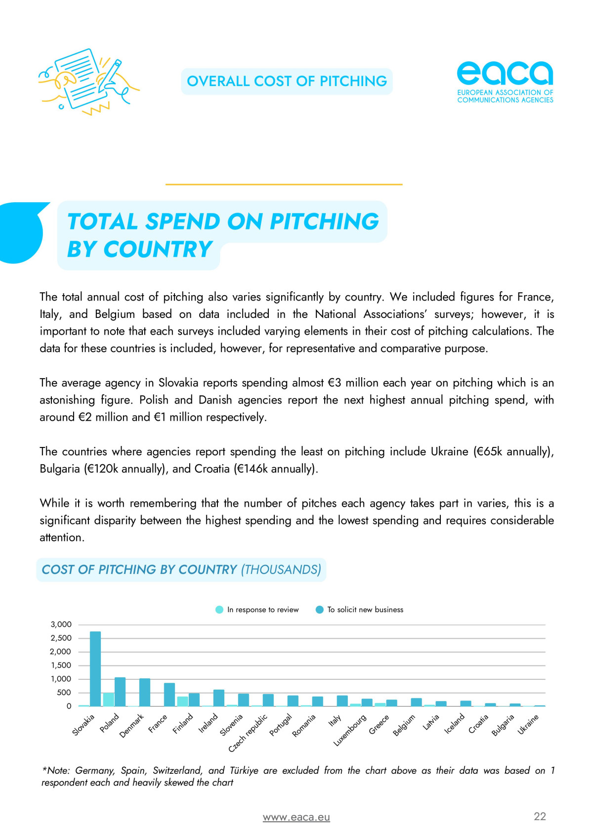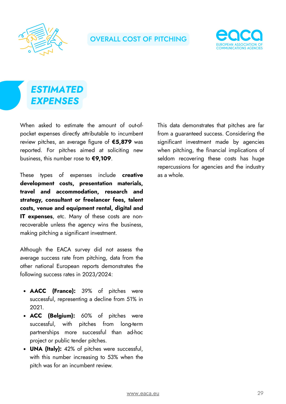 Agențiile europene cheltuie în medie 650.000 € anual pentru participarea la pitch-uri. Un pitch de new business implică și la nivelul agențiilor europene, în medie 8 persoane, fiecare alocând aproximativ 48 de ore pentru pregătirea pitch-ului. La nivel European, doar 42% dintre propunerile creative câștigătoare sunt implementate efectiv.