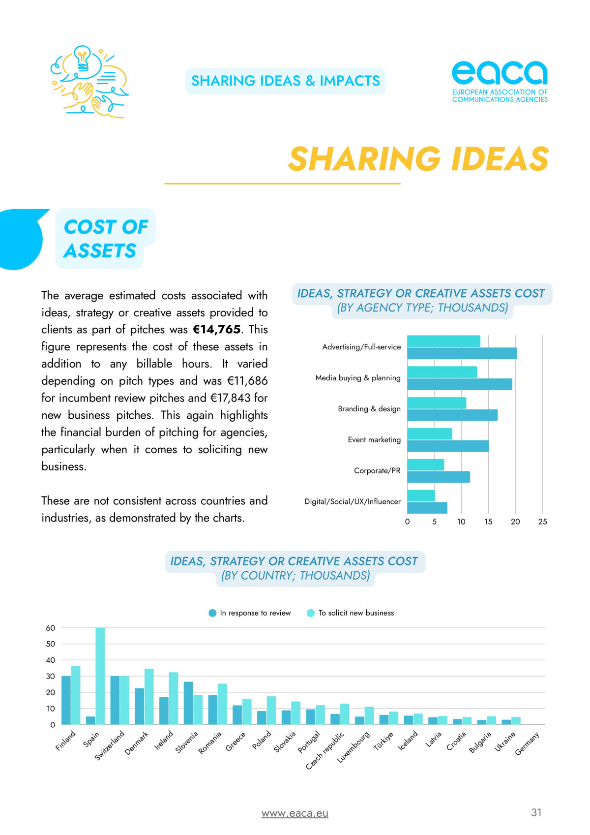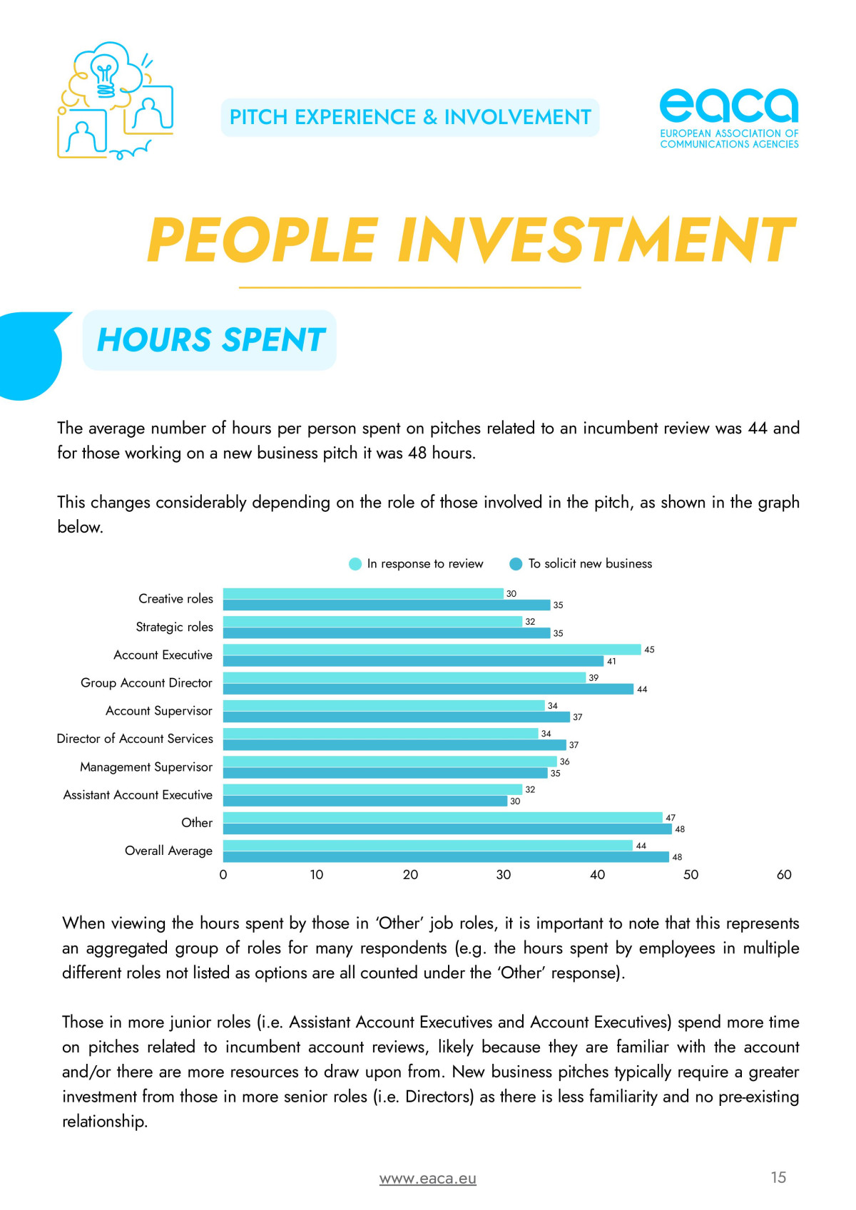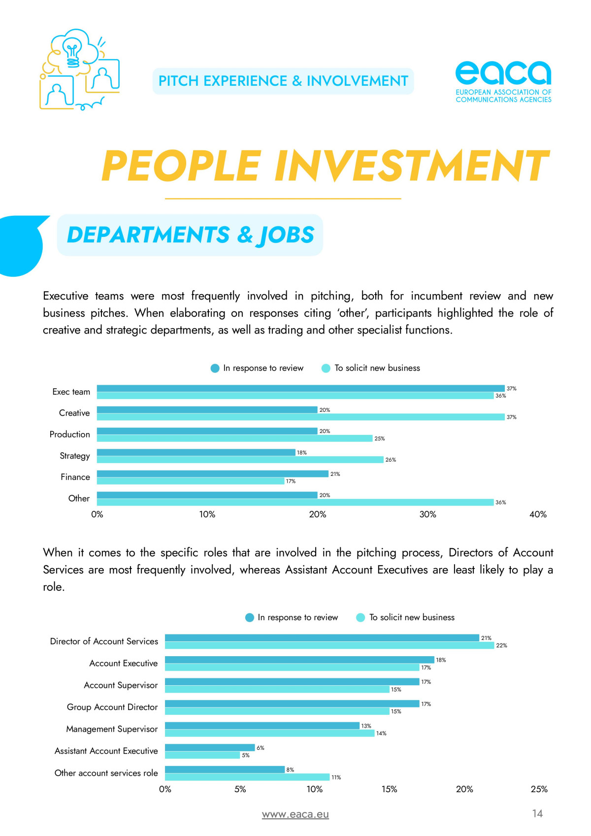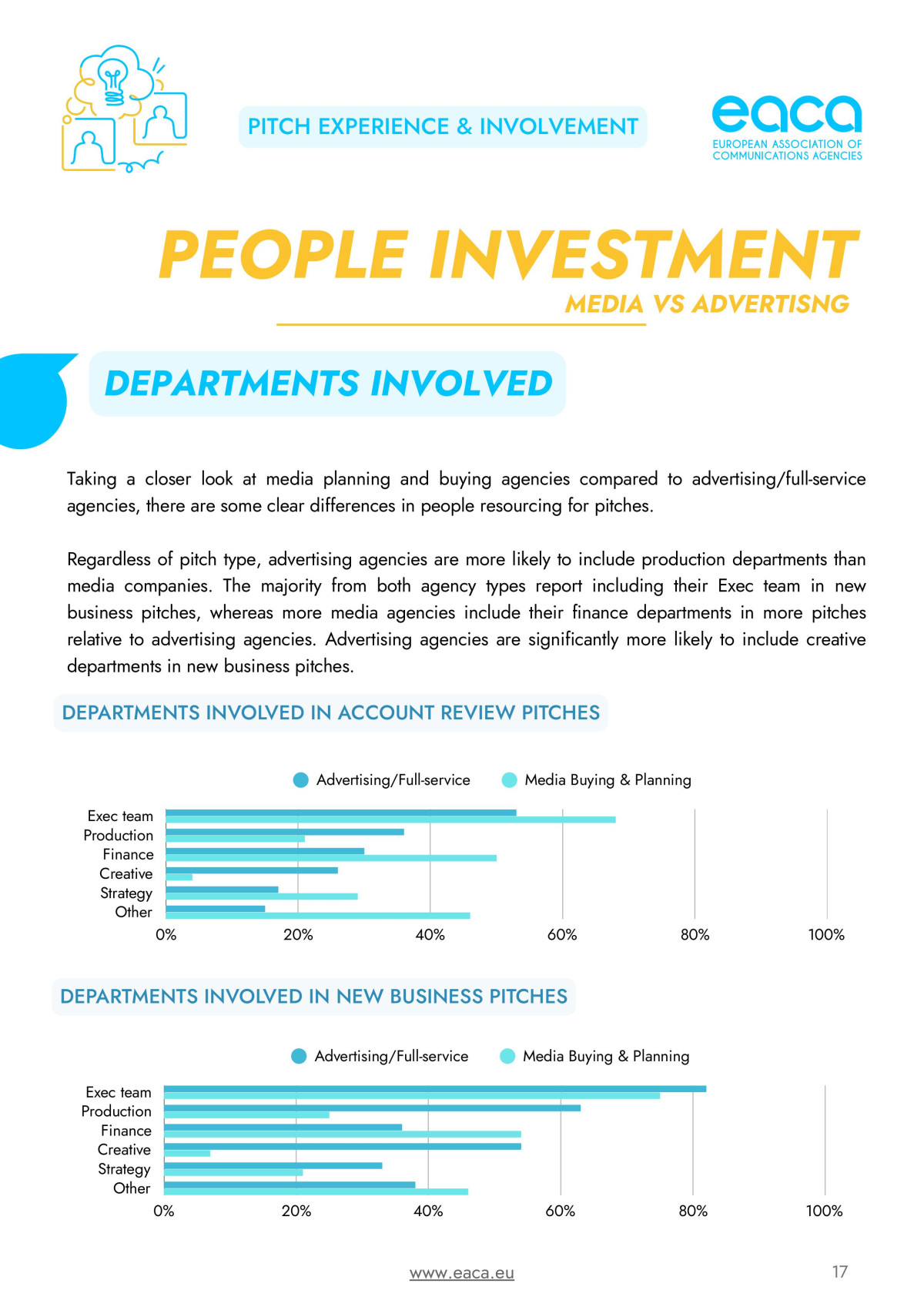 Agențiile europene cheltuie în medie 650.000 € anual pentru participarea la pitch-uri. Un pitch de new business implică și la nivelul agențiilor europene, în medie 8 persoane, fiecare alocând aproximativ 48 de ore pentru pregătirea pitch-ului. La nivel European, doar 42% dintre propunerile creative câștigătoare sunt implementate efectiv.