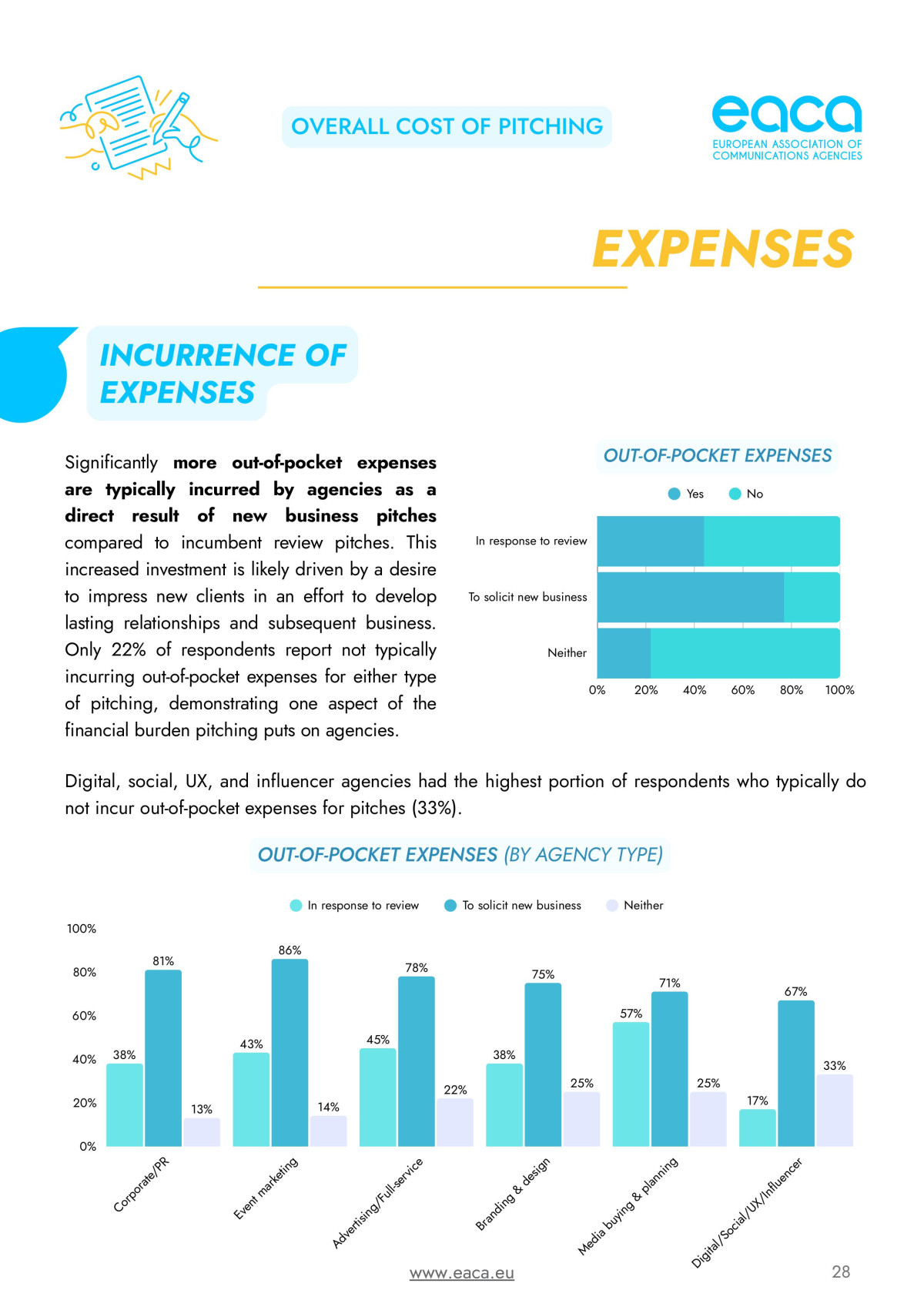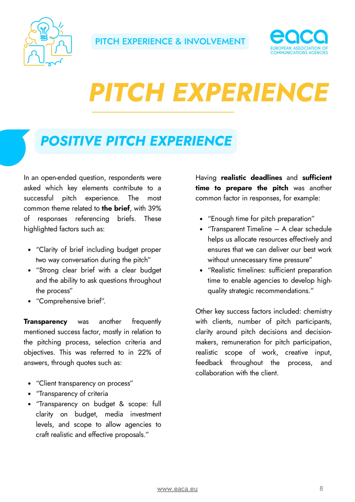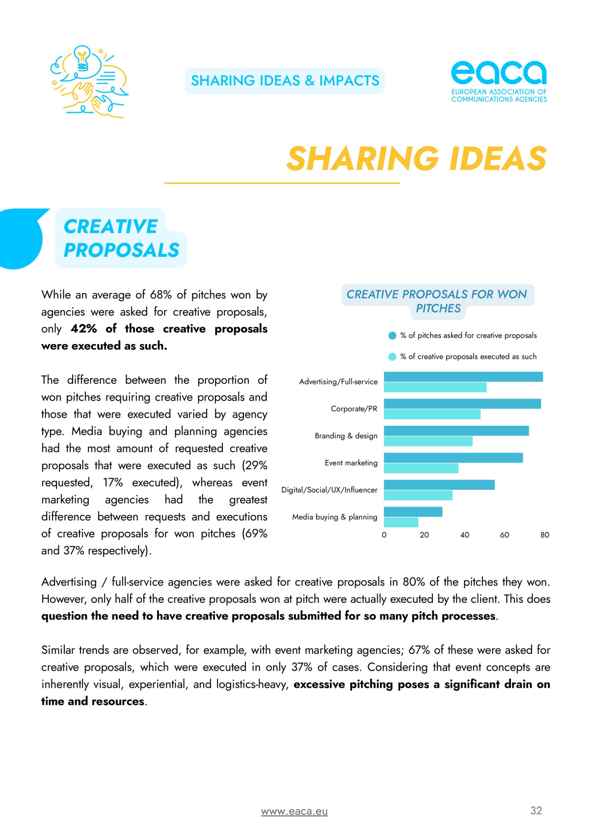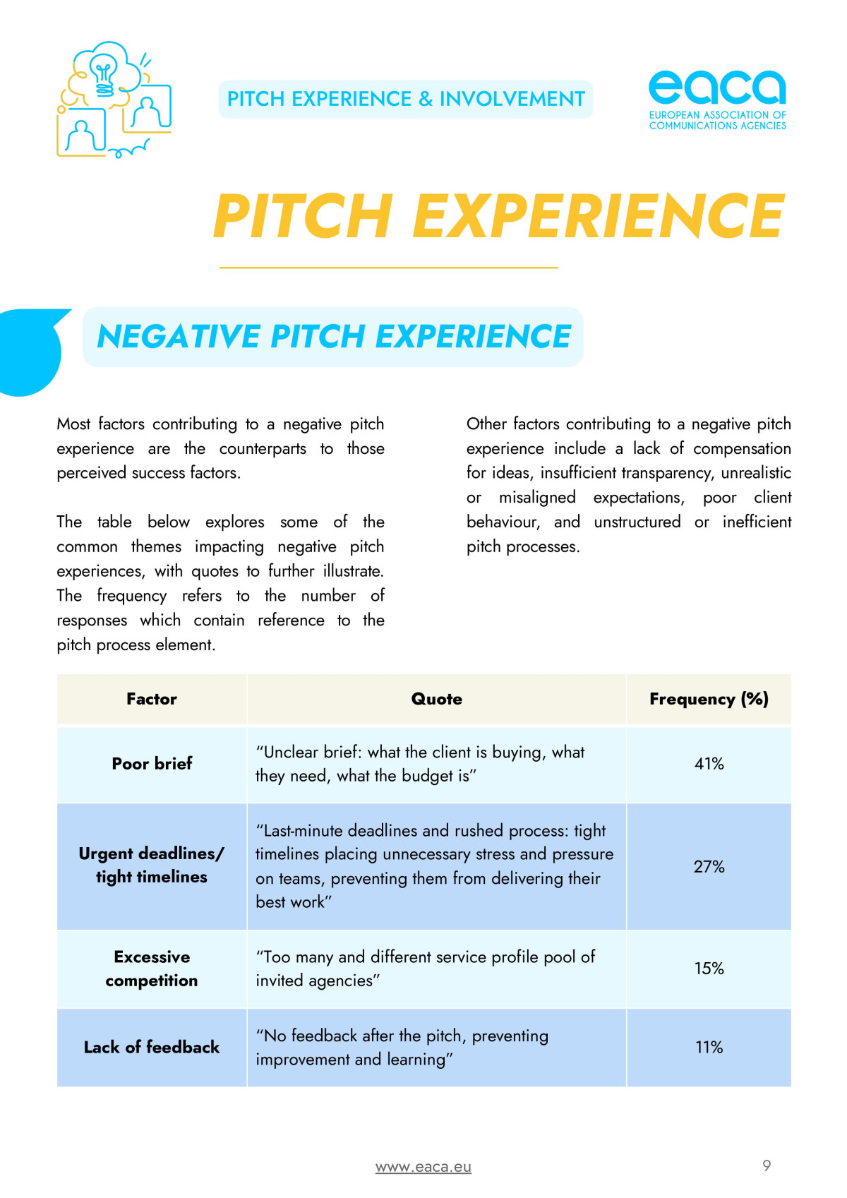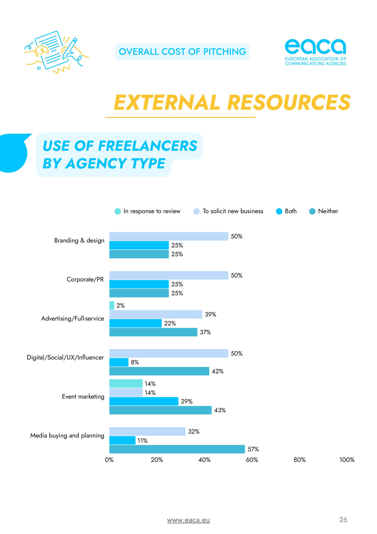 Agențiile europene cheltuie în medie 650.000 € anual pentru participarea la pitch-uri. Un pitch de new business implică și la nivelul agențiilor europene, în medie 8 persoane, fiecare alocând aproximativ 48 de ore pentru pregătirea pitch-ului. La nivel European, doar 42% dintre propunerile creative câștigătoare sunt implementate efectiv.