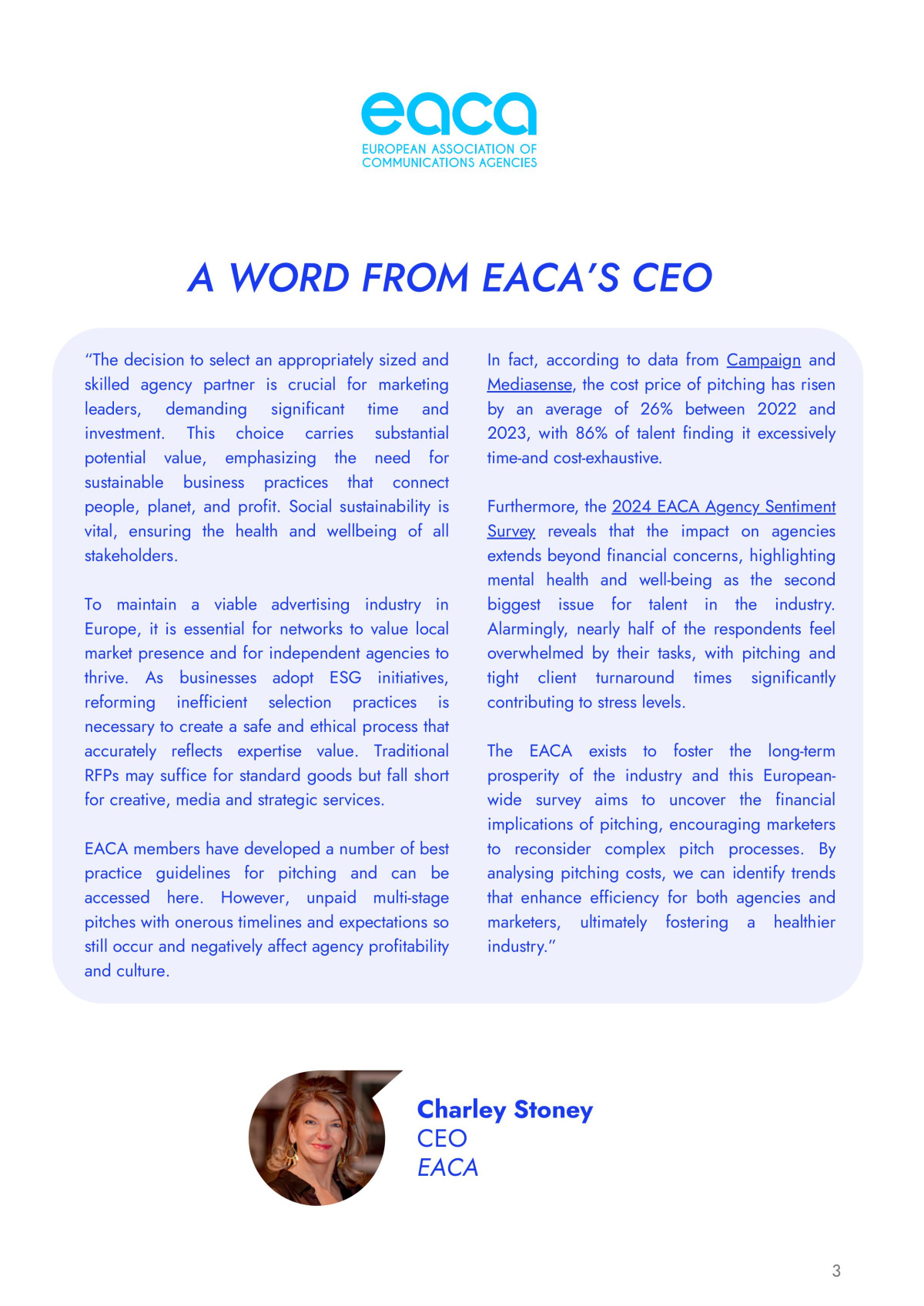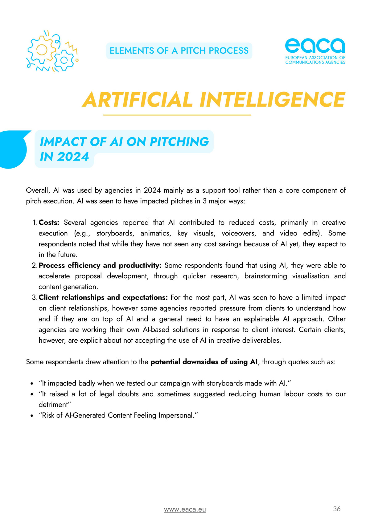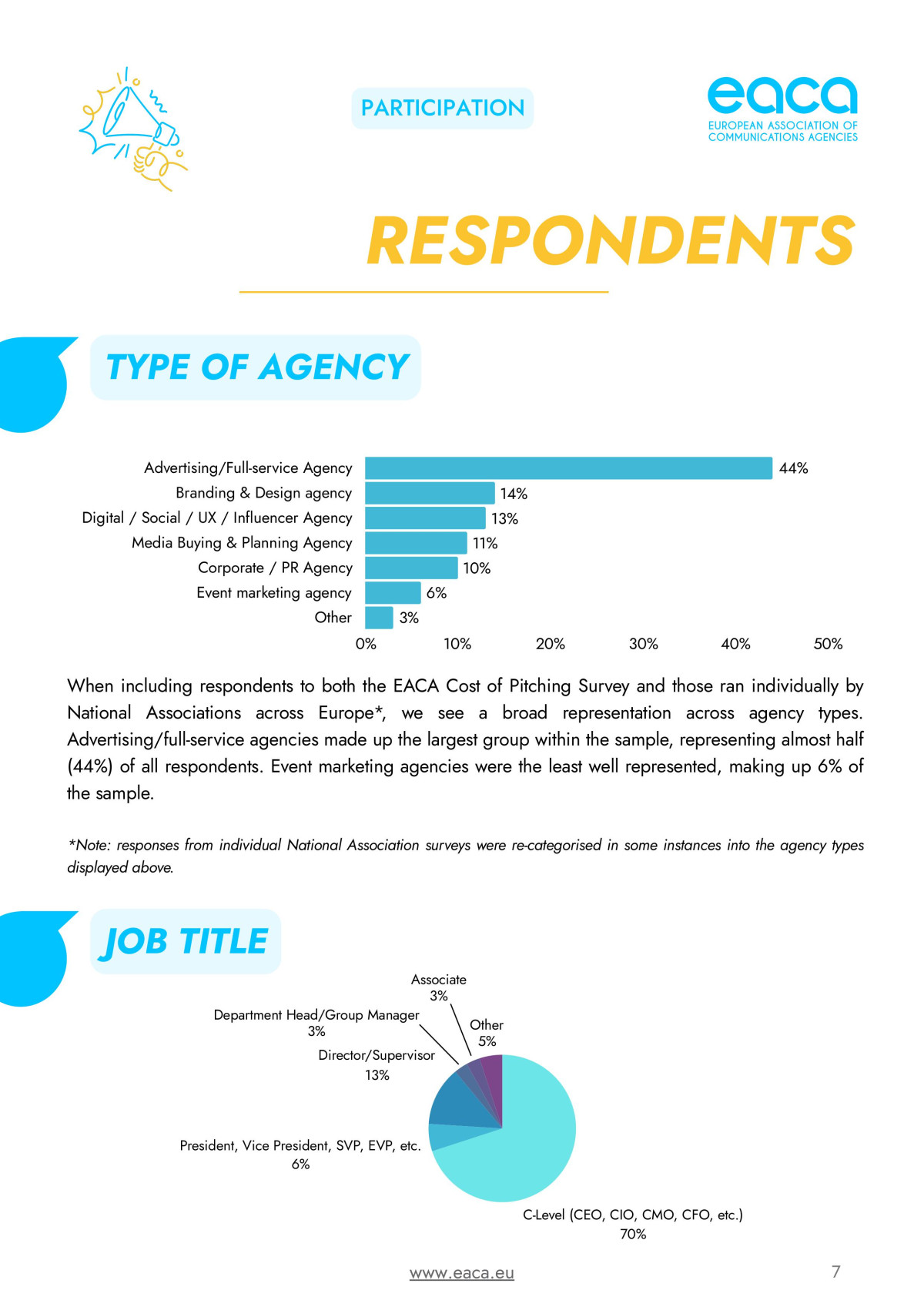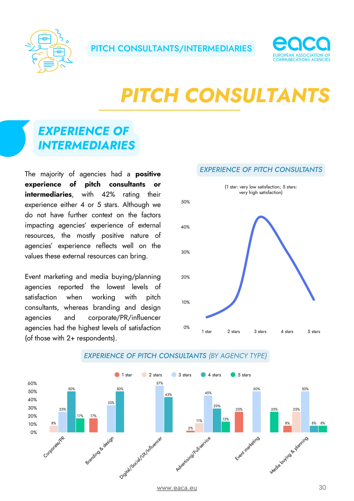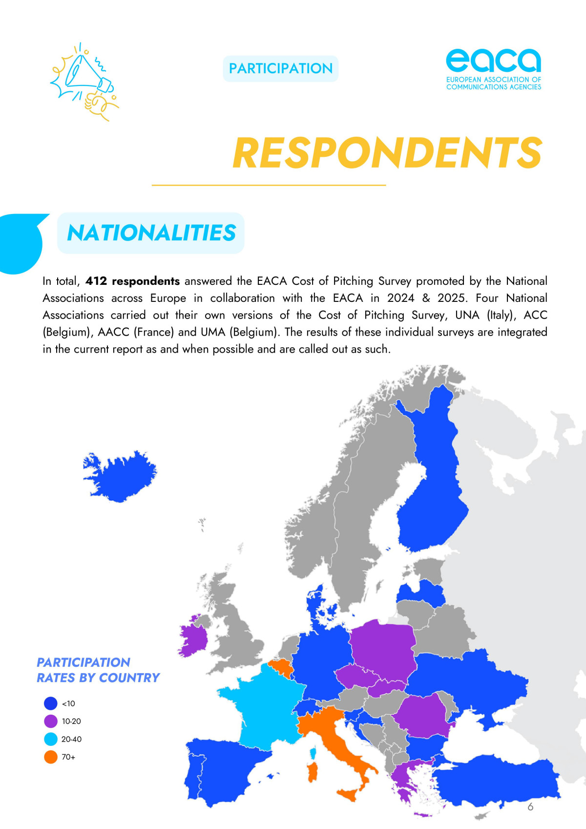 Agențiile europene cheltuie în medie 650.000 € anual pentru participarea la pitch-uri. Un pitch de new business implică și la nivelul agențiilor europene, în medie 8 persoane, fiecare alocând aproximativ 48 de ore pentru pregătirea pitch-ului. La nivel European, doar 42% dintre propunerile creative câștigătoare sunt implementate efectiv.