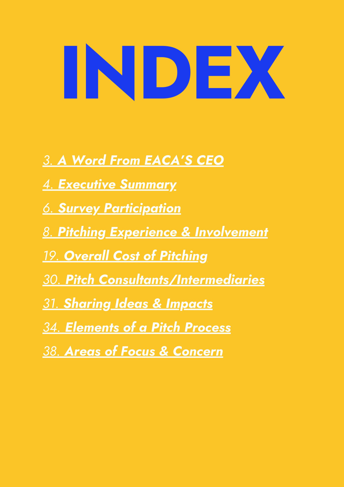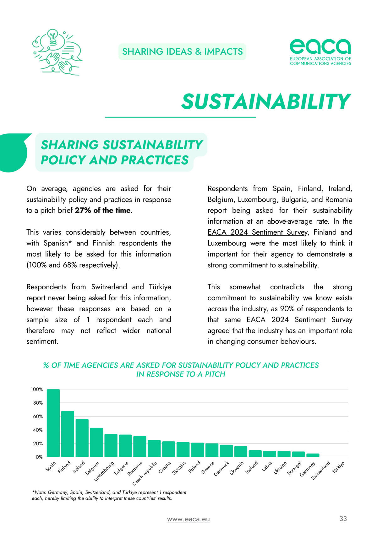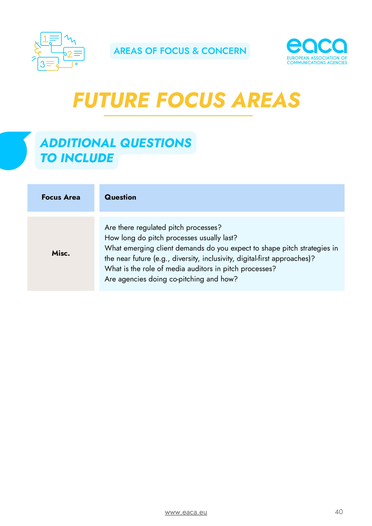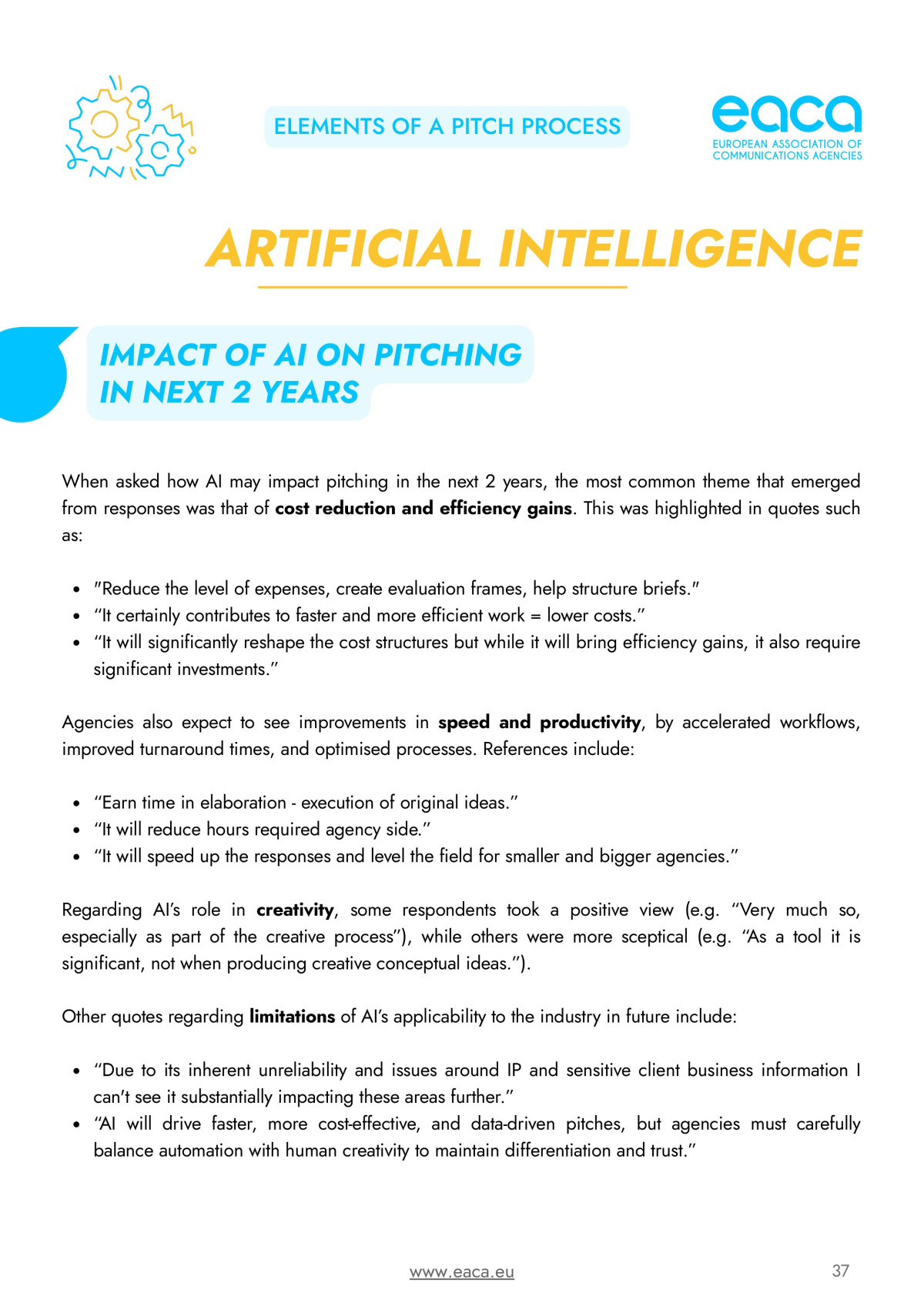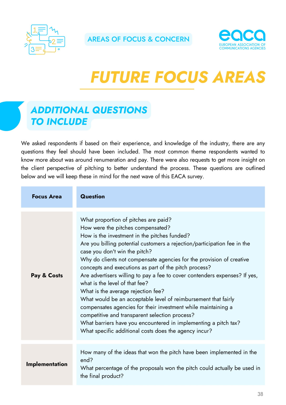 Agențiile europene cheltuie în medie 650.000 € anual pentru participarea la pitch-uri. Un pitch de new business implică și la nivelul agențiilor europene, în medie 8 persoane, fiecare alocând aproximativ 48 de ore pentru pregătirea pitch-ului. La nivel European, doar 42% dintre propunerile creative câștigătoare sunt implementate efectiv.