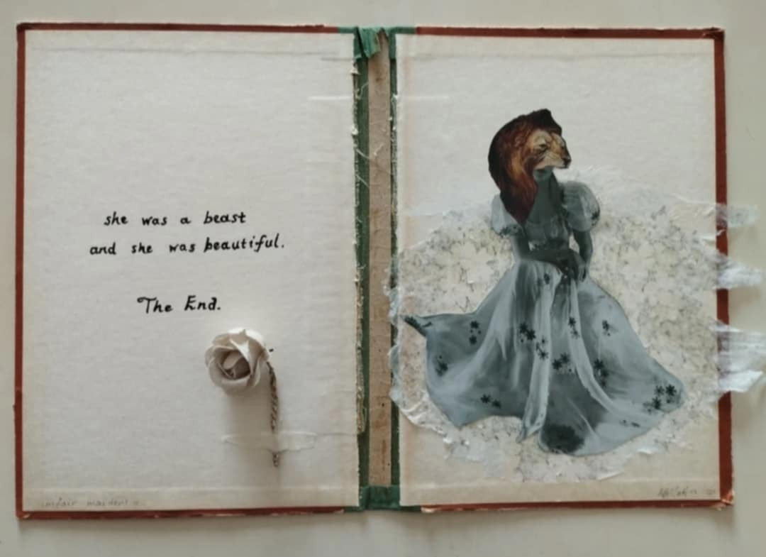 The works that were exhibited earlier this year at Hearth, for example, are part of a series I call “Unfair Maidens”, where the maiden unapologetically and fiercely claims justice for herself, even if this risks being called all kinds of ugly. Authors who have absolutely inspired me with their brilliantly twisted remakings of these narratives include Angela Carter, Margaret Atwood, Madeline Miller and Lauren Groff.