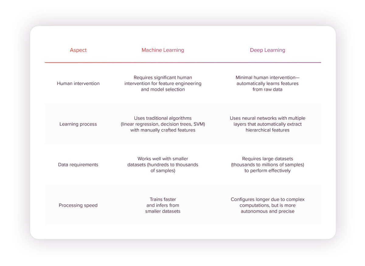Înțelegerea diferenței dintre Deep Learning și Machine Learning: Deep Learning reprezintă un progres revoluționar față de abordările tradiționale de Machine Learning. În timp ce algoritmii de Machine Learning necesită experți umani care să identifice și să adauge manual caracteristici relevante (precum „utilizatorul a dat click pe butoanele roșii” sau „utilizatori de pe dispozitive mobile”), algoritmii de Deep Learning descoperă singuri aceste tipare și nenumărate altele pe care oamenii nu s-ar gândi niciodată să le caute.