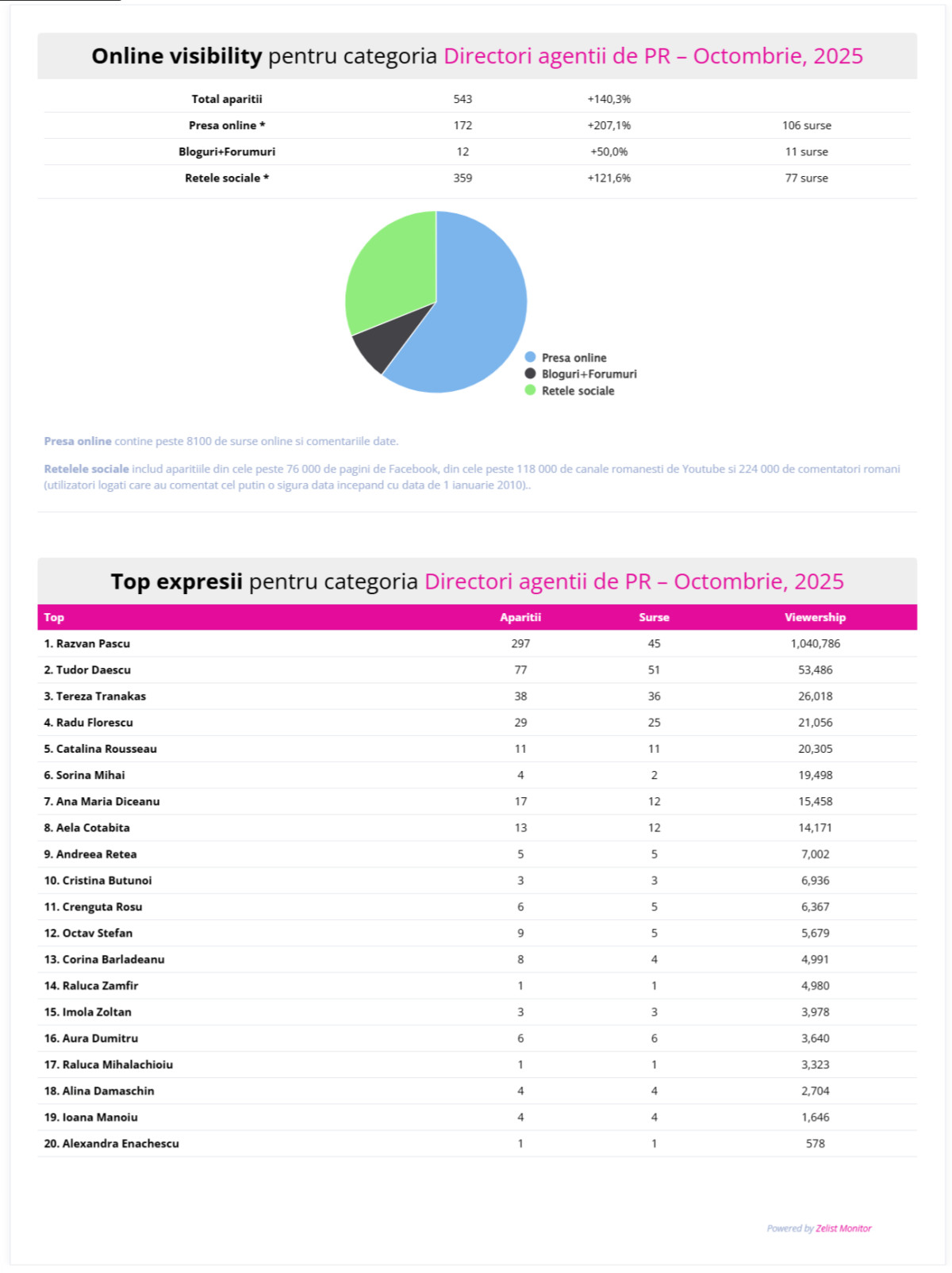 In topul celor mai vizibili directori ai agentiilor de PR in online si pe Facebook din octombrie efectuat de ZeList si publicat lunar de IQads, Razvan Pascu ocupa locul intai (1,040,786 de views) si pe locul al doilea se afla Tudor Daescu (53,486 de views). Tereza Tranakas (26,018 viewership) se afla pe locul al treilea dupa ce a urcat cincisprezece poziti fata de luna precedenta.