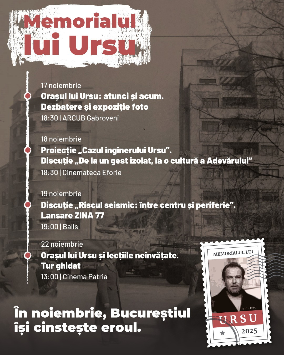 - pe 17 noiembrie, de la ora 18:30, la ARCUB Gabroveni, sub umbrela „Orașul lui Ursu atunci și acum”, va avea loc o dezbatere și expoziție foto. Discuțiile vor lega riscul asumat de dizidenți în trecut de riscurile remanente din orașul de astăzi.