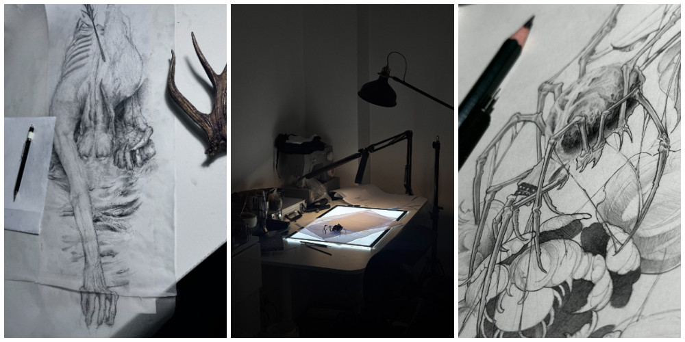 Pentru Anid Alex, singura provocare reală este rafinamentul în procesul de construcție al unui tatuaj: cât de compact se citește stilul, cât de bine se simte vizual și cât de coerent este construit. A înscris două lucrări în competiția VELO, cărora le-a dedicat câteva zile întregi, fără a fi perturbat de altceva, și le-a realizat tradițional, pe foaie, medii mixte de creion, peniță și tuș negru.