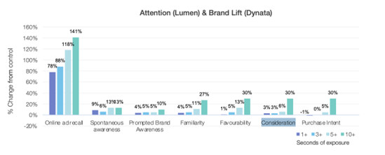 Într-o meta-analiză Teads × Lumen despre legătura dintre “attention” și “brand outcomes”, apar praguri foarte concrete (măsurate ca „attentive seconds” necesare pentru impact semnificativ):