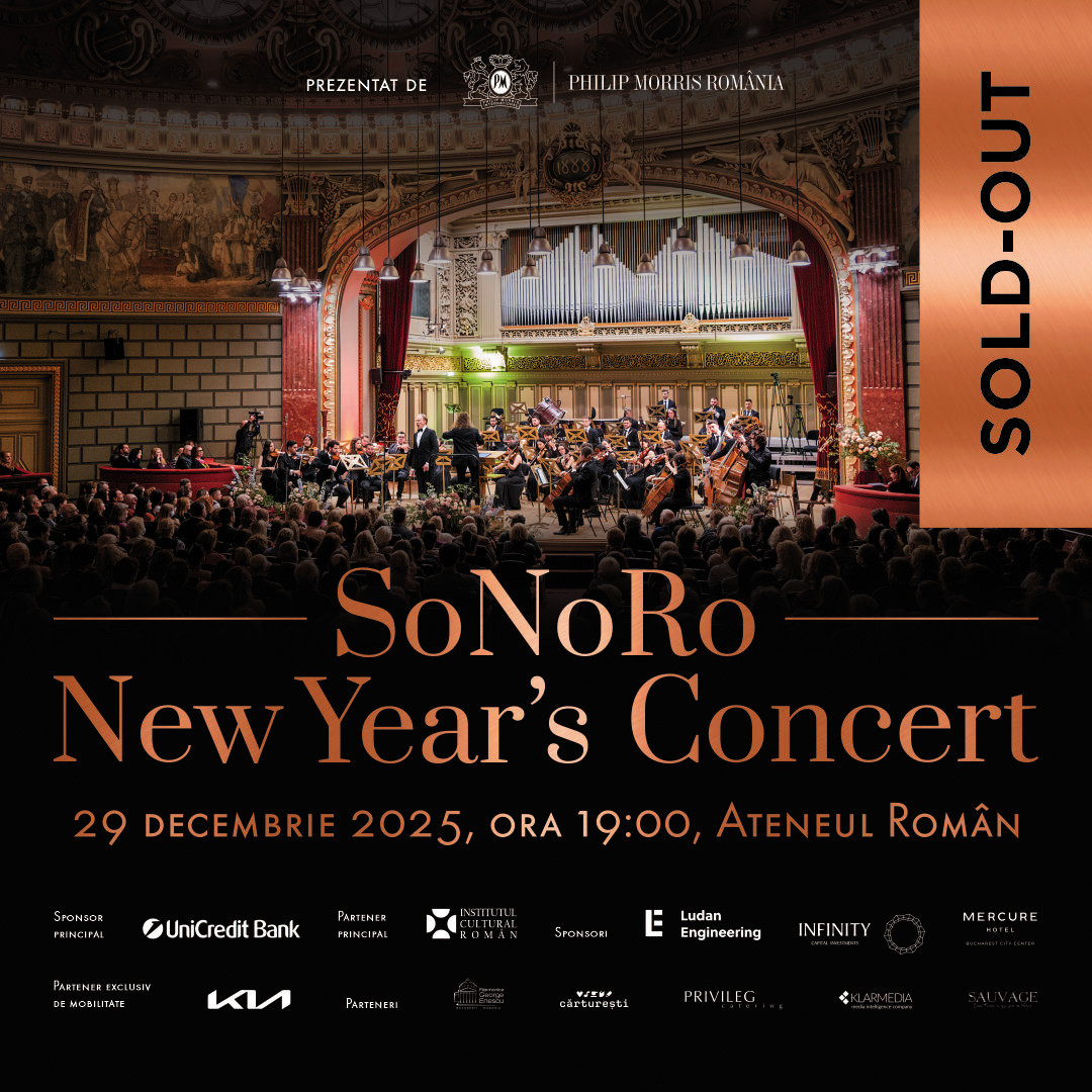 În spiritul concertelor care marchează trecerea dintr-un an în altul, SoNoRo organizează Concertul de Anul Nou – luni, 29 decembrie 2025, ora 19:00, la Ateneul Român. În program, lucrări de Johann Sebastian Bach, Antonín Dvořák, Nino Rota, Astor Piazzolla, Pablo de Sarasate și Aldemaro Romero, în interpretarea soliștilor Alexis Cárdenas (vioară), Sebastian Manning (vioară), Răzvan Popovici (violă), Justus Grimm (violoncel) și Knut-Erik Sundquist (contrabas), împreună cu SoNoRo Strings Orchestra dirijată de Diana Ketler. Concertul este sold-out, iar organizatorii îi mulțumesc publicului pentru interesul acordat.
