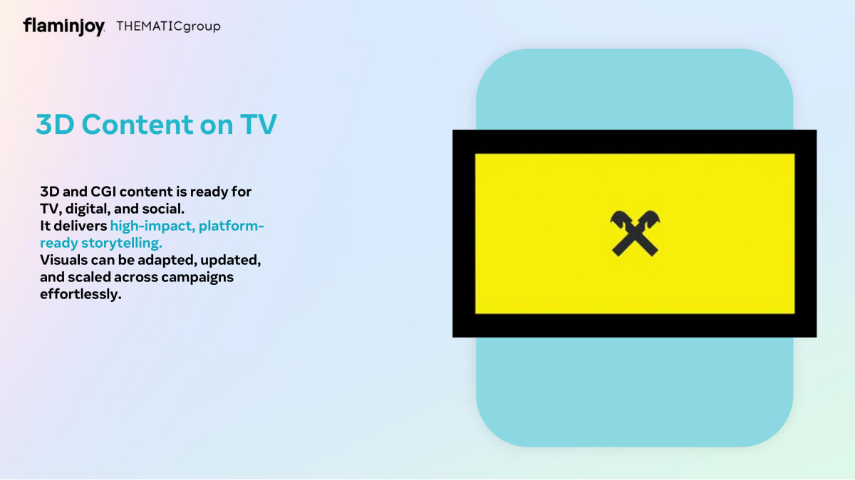 Conținutul 3D creează senzația de profunzime și volum, fiind optimizat pentru TV, digital și social, fără a necesita tehnologii speciale de afișare.