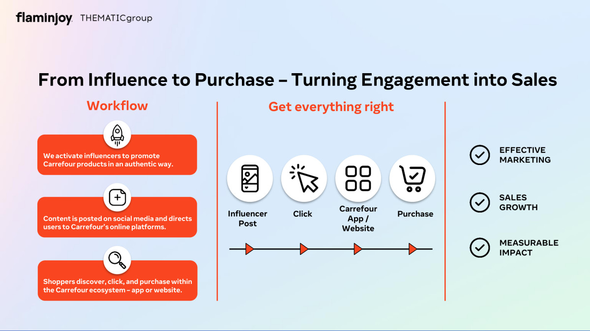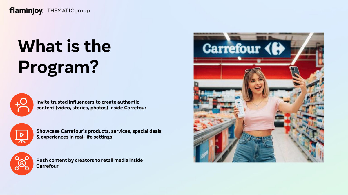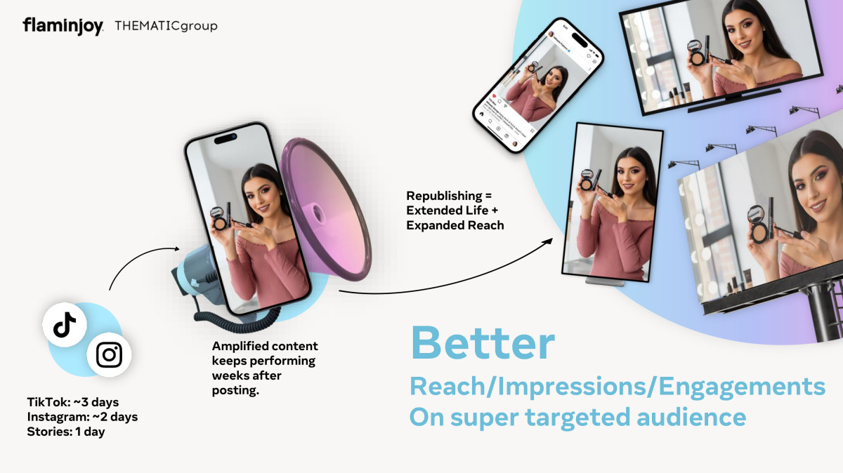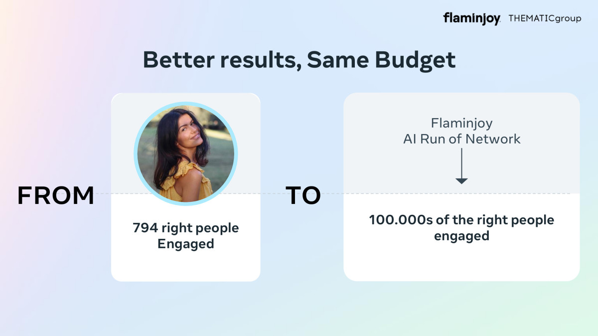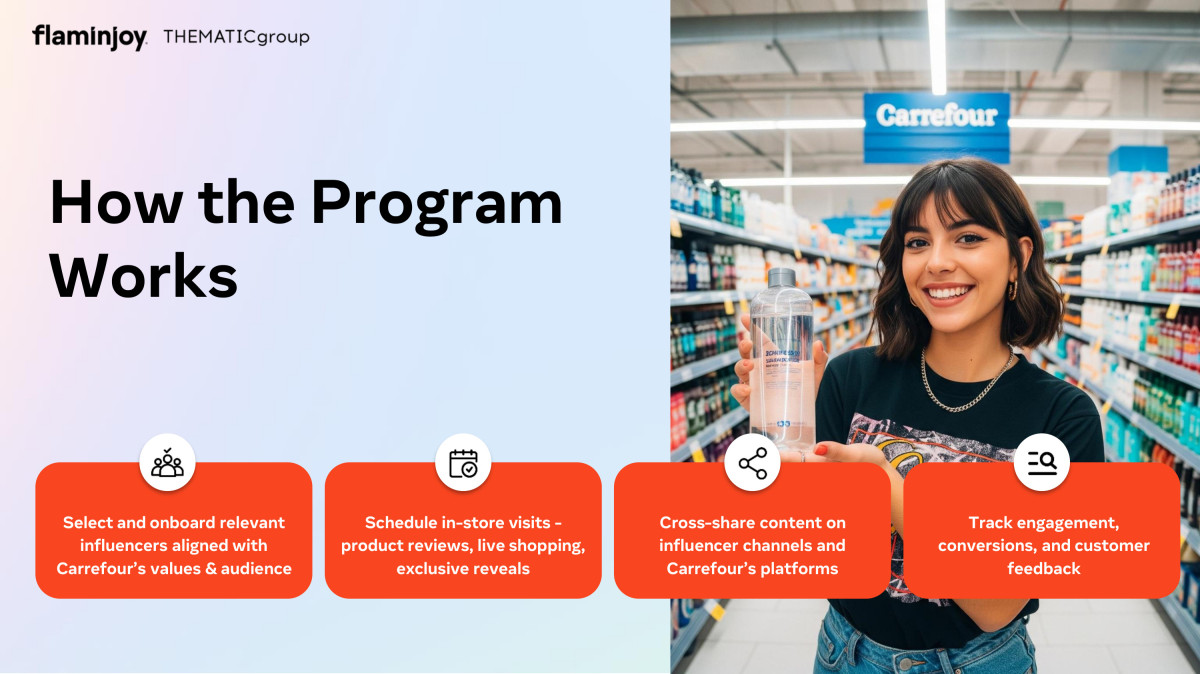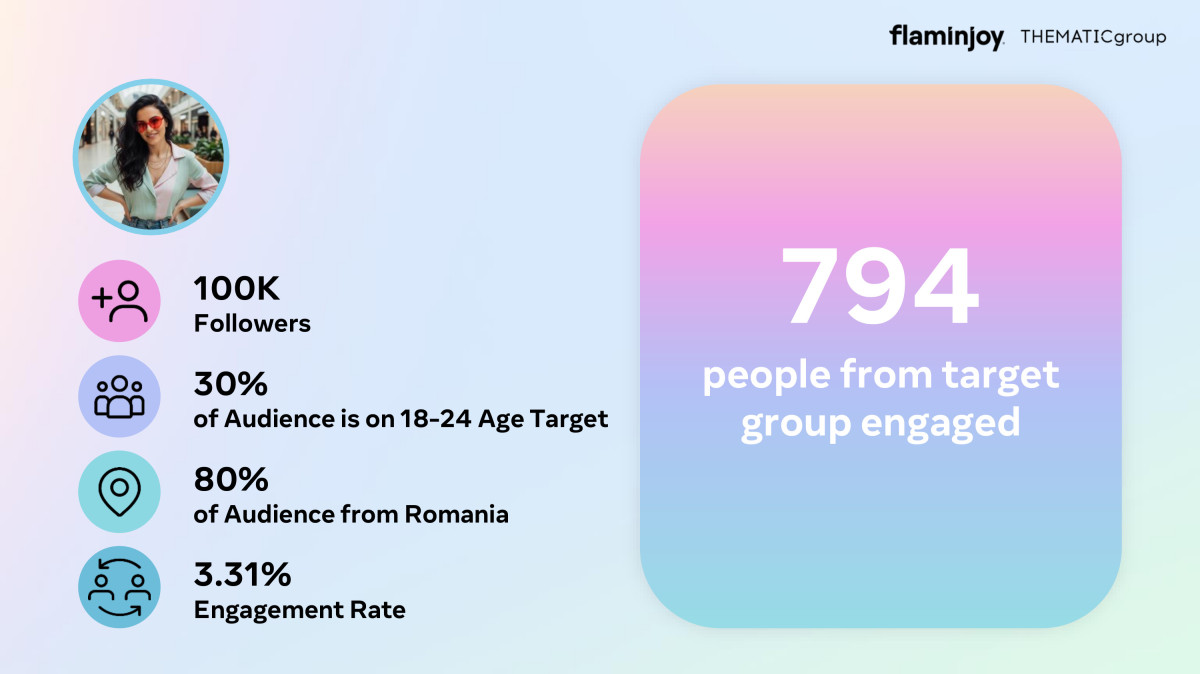 Tehnologia Flaminjoy analizează datele de performanță și aliniază automat creatorul potrivit cu audiența relevantă, în contextul media optim. Totul fără costuri adiționale și fără complexitate operațională pentru brand.