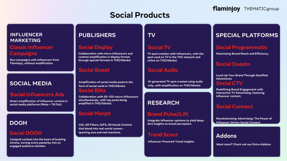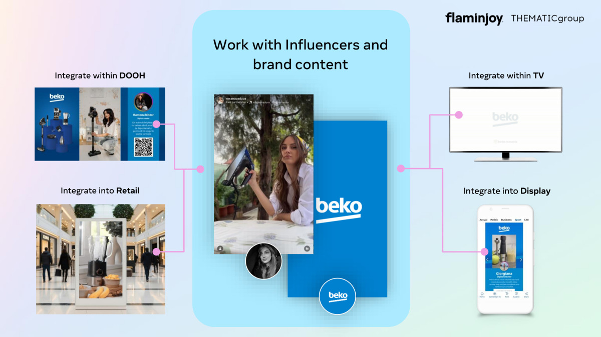 Flaminjoy extinde rolul influencerilor din social media către un ecosistem media complet, unde live-ul, CGI-ul, 3D-ul, TV-ul, OOH-ul și commerce-ul funcționează împreună. Update-urile din 2026 nu sunt doar formate noi, ci moduri diferite de a gândi distribuția, impactul și rezultatele conținutului creat cu influenceri.