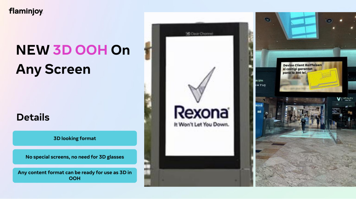 - 3D Content OOH - Conținut 3D adaptat pentru ecrane outdoor, care transformă spațiile urbane în experiențe vizuale spectaculoase.