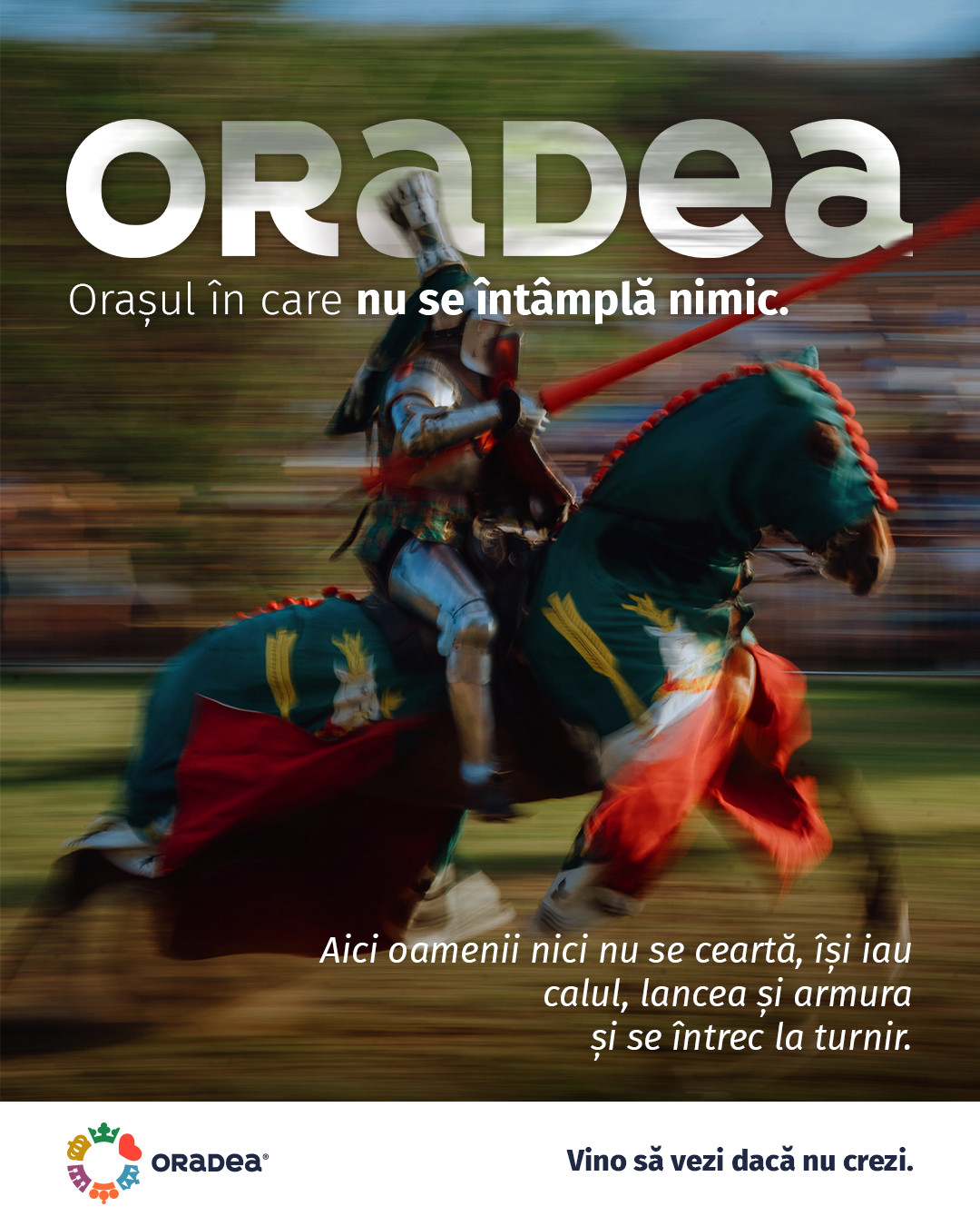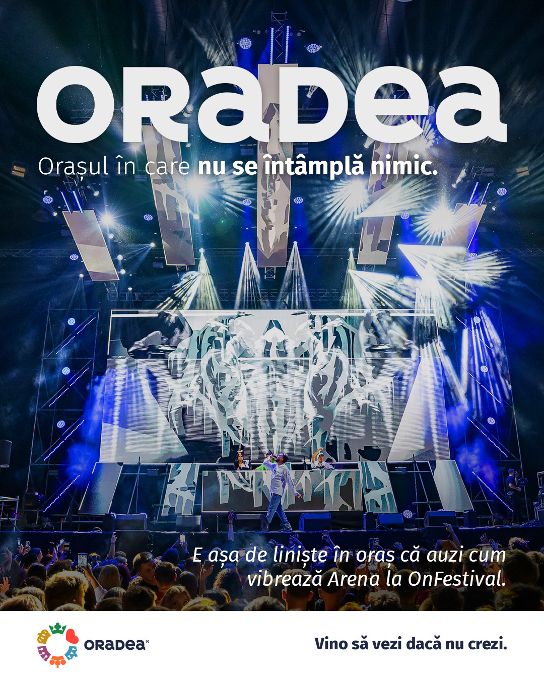 Când nu vrei să convingi, dar convingi, este modul în care funcționează acesta campanie, care nu încearcă să „combată mituri” și nu se luptă cu prejudecăți. Doar le preia una cate una și le lasă să se contrazică singure în contact cu realitatea. Fără push sau explicații, doar contrast. Pentru că, uneori, cel mai eficient mod de a atrage atenția e să spui „nimic”. Campania nu vrea să demonteze mituri. Nu vrea să rescrie Wikipedia. Nu dă note și nu cere justificări. Doar spune, pe un ton calm: „Oradea. Orașul în care nu se întâmplă nimic. Vino să vezi daca nu crezi” o invitație deschisă, că să descoperi singur adevărul.
