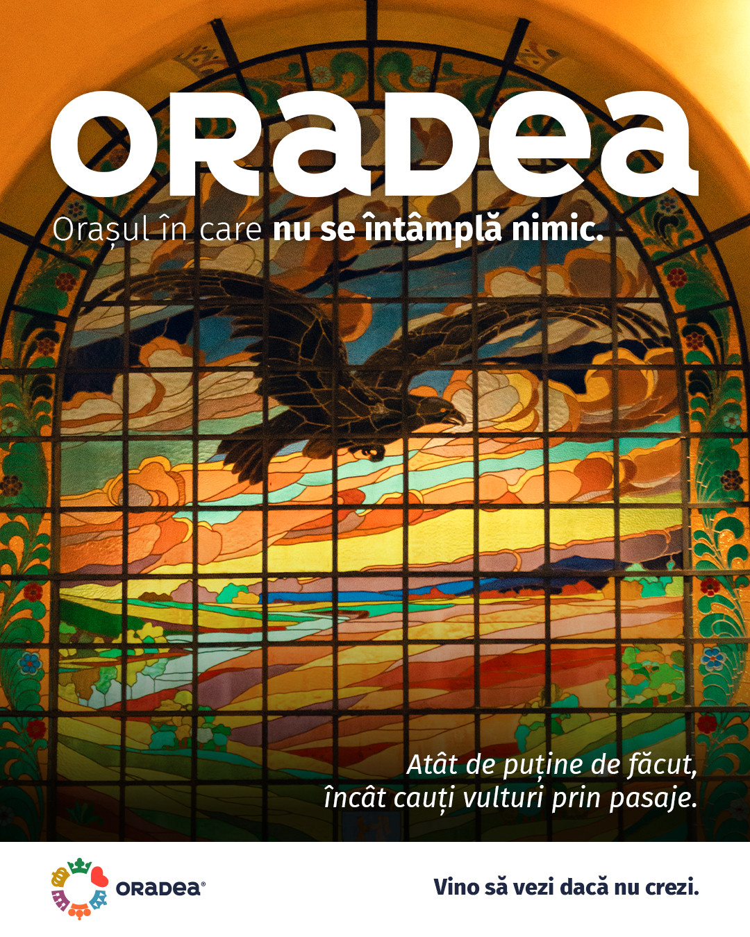 După ce prima etapă a campaniei, "Efectul Oradea", te-a invitat să descoperi orașul prin hubloul avionului, fără mari așteptări, cu o doză sănătoasă de scepticism, urmată de o plăcuta surpriză, a doua parte vine să apese cu zâmbetul pe buze pe pedala procrastinarii turistice. Am luat o prejudecată și am făcut din ea headline-ul principal: „Oradea. Orașul în care nu se întâmplă nimic.” Nu pentru că ar fi așa. Ci pentru că uneori cel mai bun răspuns e o întrebare retorică ambalată frumos. Autoironia devine aici un mecanism de seducție. O ușă deschisă pentru dialog.