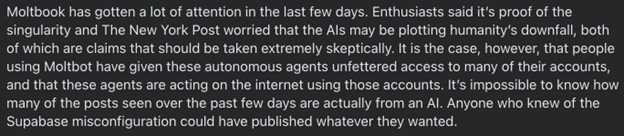 Marius Comper îl citează pe Hacker Jamieson O'Reilly care a semnalat un lucru foarte important pe care l-a descoperit în scheletul Moltbook: securitate slabă și API keys expuse pe o bază de date care și-așa era publică. Ce înseamnă asta? Că multe dintre conversațiile controversate care s-au viralizat ar putea să fie de fapt scrise de oameni care au profitat de vulnerabilitățile platformei.