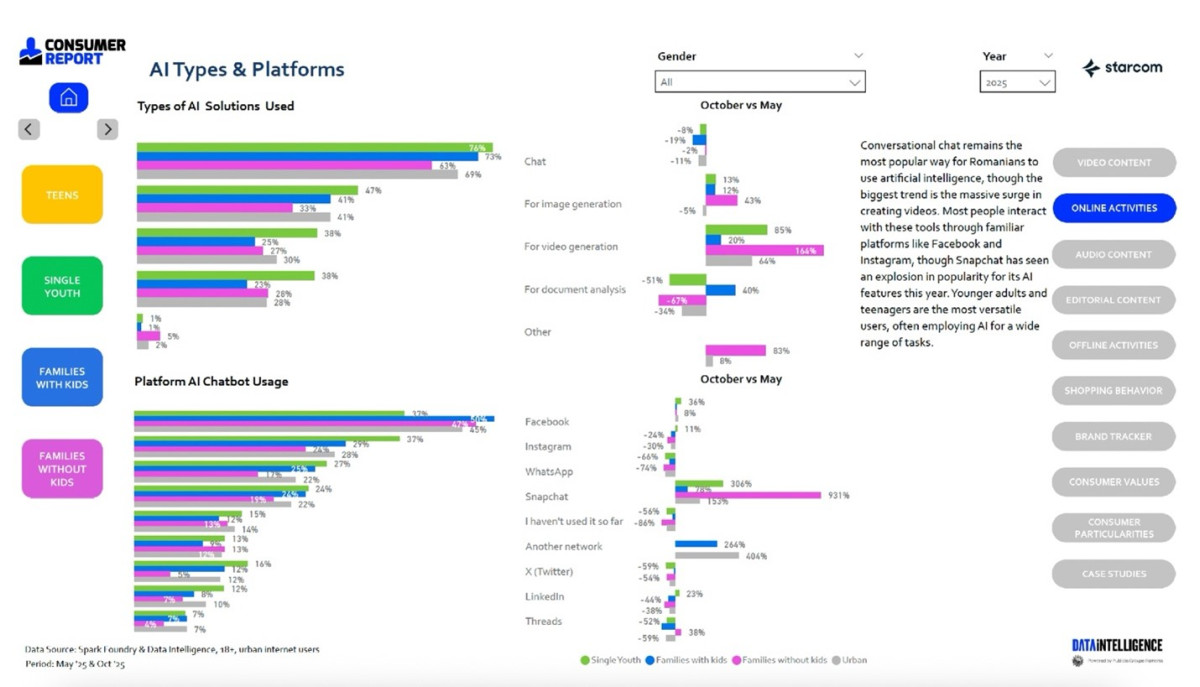 Starcom România lansează a 12-a ediție a Consumer Report, studiul anual realizat de echipa Data Intelligence, care oferă o radiografie amplă a modului în care românii consumă media, folosesc tehnologia și iau decizii de cumpărare într-un context digital în continuă transformare. Ediția din 2025 evidențiază un fenomen major: inteligența artificială (IA) devine linia de separare între generațiile din România, marcând una dintre cele mai accelerate schimbări din comportamentul consumatorilor.