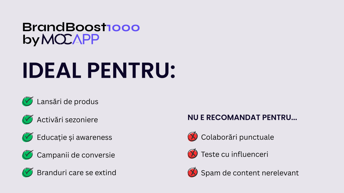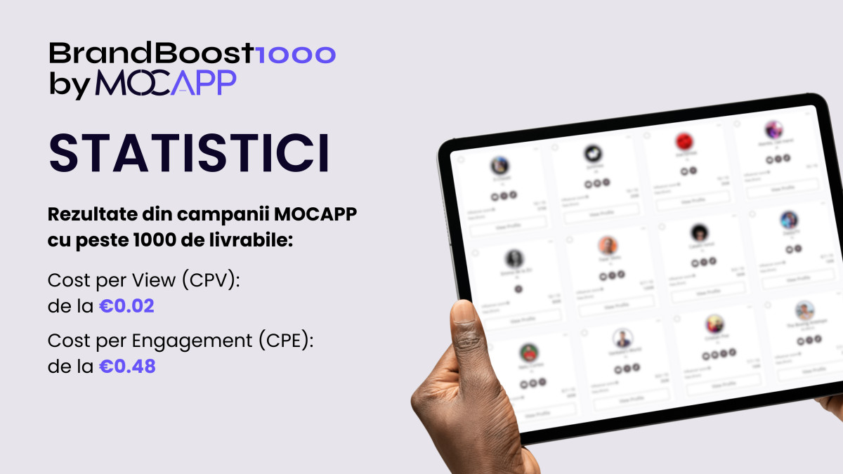 Soluția BrandBoost1000 rezolvă această provocare, oferind acces la o forță creativă de până la 1.000 de creatori de conținut preselectați și verificați, coordonați de echipa de experți MOCAPP.