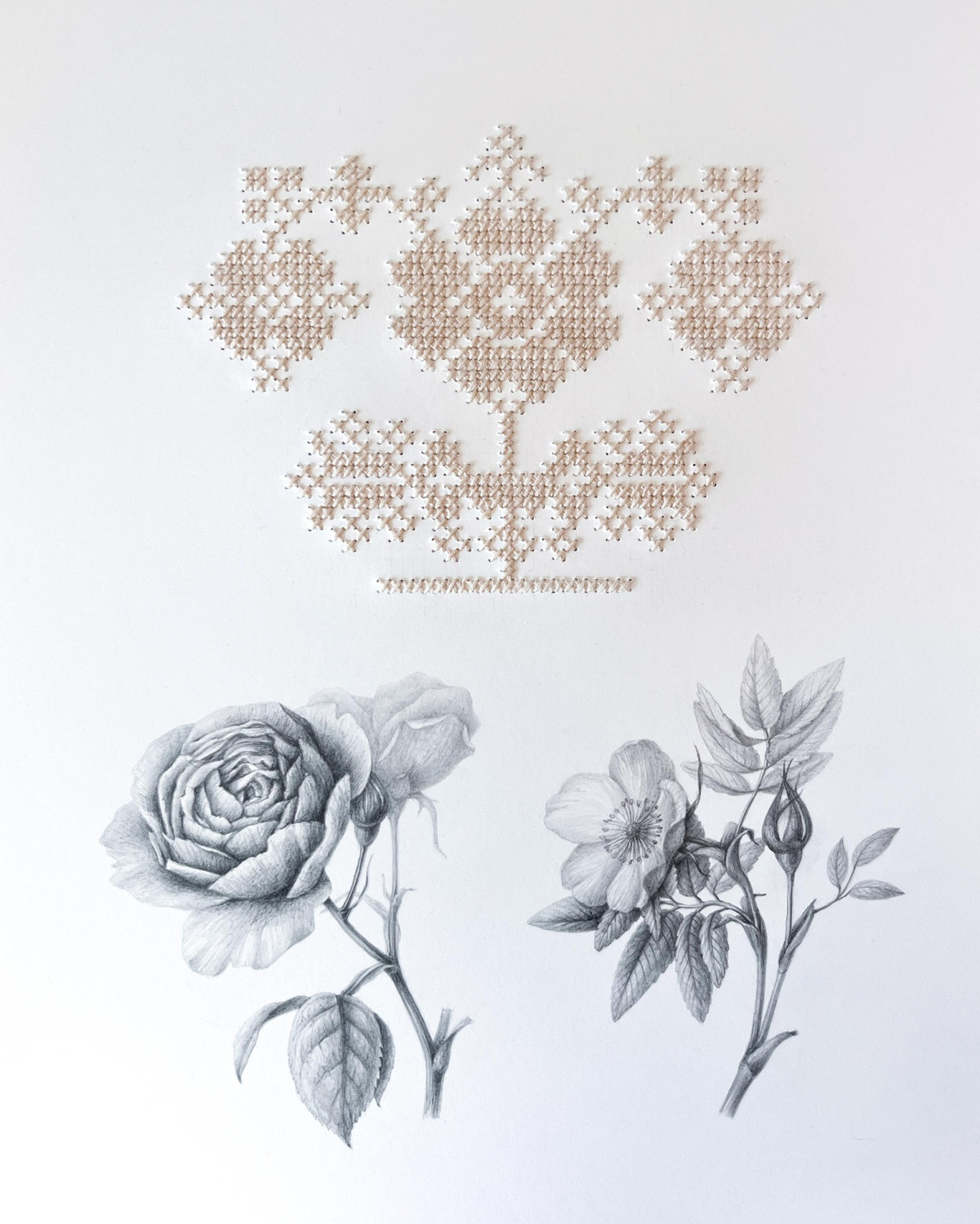 Linia devine elementul central al proiectului: traseu, urmă, gest desenat sau cusut, legătură între experiențe senzoriale, emoționale și științifice. Cusătura apare ulterior în lucrări de mici dimensiuni, reprezentând Pomul Vieții în variante inspirate din arta textilă săsească, realizate în aceeași estetică monocromă. Intervențiile textile rămân discrete, evitând o abordare folcloristică sau etnografică explicită. În același timp, motivul arborelui conduce spre explorarea lemnului ca material și obiect.