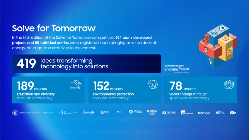 Solve for Tomorrow este competiția educațională prin care Samsung aduce tehnologia mai aproape de tineri și o transformă într-un instrument pentru progres. Lansat la nivel global în urmă cu 15 ani și desfășurat în 68 de țări, programul a inspirat peste 2,9 milioane de elevi să își descopere potențialul și să își transforme ideile în soluții cu impact real. În România, Solve for Tomorrow a devenit în cinci ani o platformă educațională recunoscută, prin care mai bine de 4.300 de liceeni au avut șansa să își dezvolte competențele STEM și să fie ascultați atunci când au venit cu propuneri pentru o societate mai bună.
