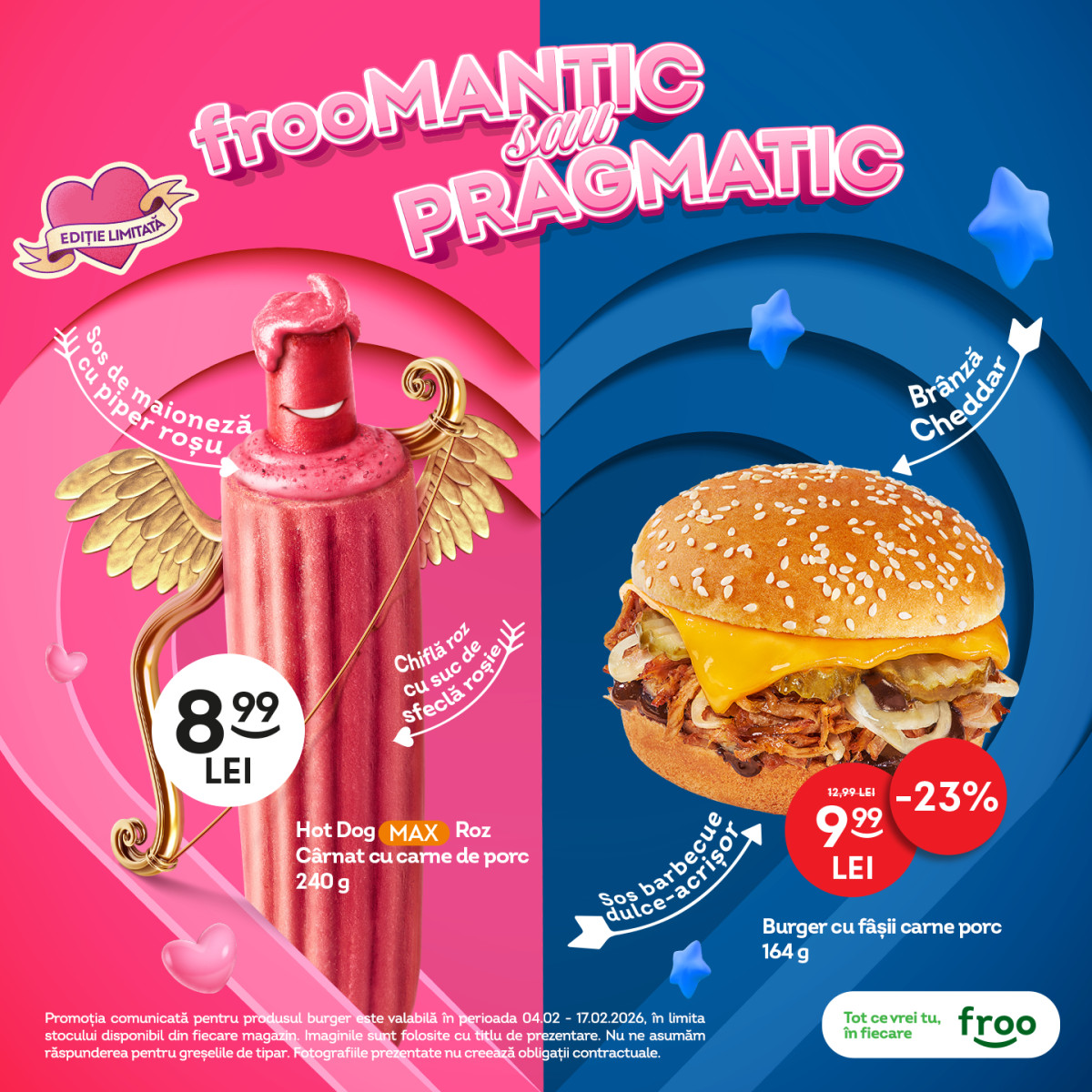 Pentru consumatorii froomantici, in cautarea momentelor de rasfat, brandul a creat produse speciale, precum Hot Dog-ul roz, realizat din chiflă cu suc de sfeclă roșie și sos de maioneză cu piper roșu, Gogoșile în formă de inimă, Brioșele de Valentine’s Day sau Crocant Box-ul cu Valentine nuggets, dar și lalelele pentru gifting rapid; în paralel, pentru consumatorii pragmatici, froo a păstrat gama originală, cu produse consacrate precum Burgerul cu fâșii de porc, Gogoșile și Brioșele cu ciocolată sau clasicele Crocant Box-uri.
