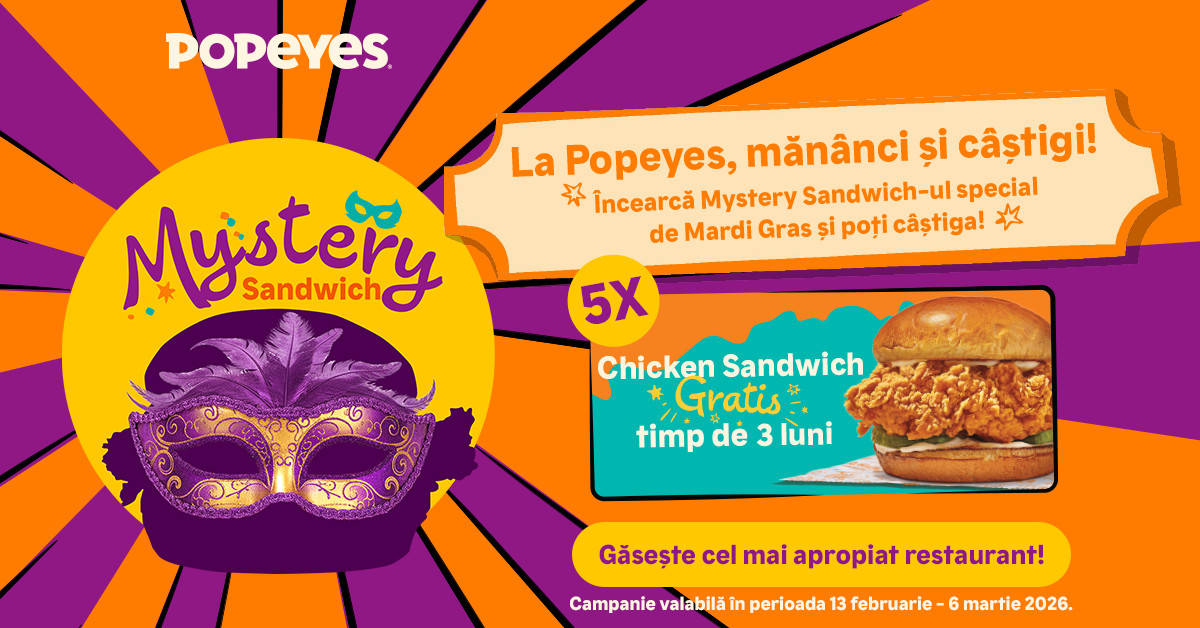 Pe 13 februarie Popeyes a lansat Mystery Sandwich, o ediție foarte limitată, disponibilă până pe 6 martie, astfel că sendvișul apare în meniul Popeyes în culorile Mardi Gras, însă fără ingrediente vizibile, doar indicii subtile și o poveste construită în jurul ideii de „gust pe care trebuie să-l descoperi singur”. Mai mult, tot între 13 februarie și 6 martie Popeyes derulează o campanie dedicată tuturor celor care aleg Mystery Sandwich, mecanismul fiind unul simplu și accesibil. Participanții intră automat în tragerea la sorți pentru unul dintre cele cinci vouchere, fiecare voucher oferind gratuit trei luni de Chicken Sandwich.