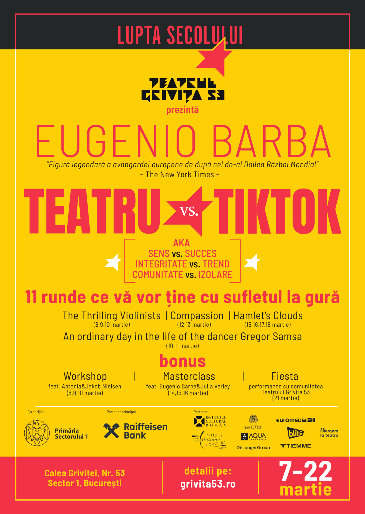 Programul are loc în perioada 7–22 martie 2026, la Teatrul Grivița 53 din București. Biletele pot fi achiziționate prin bilet.ro.