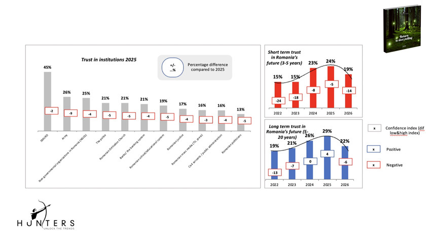 În Hunters 2026 înregistrăm un declin semnificativ pe acest indicator la toate nivelurile: încrederea în viitor pe termen scurt, pe termen lung și încrederea în instituții. În plus, sunt afectați indicatori precum energia pozitivă, optimismul, empatia, sănătatea mintală