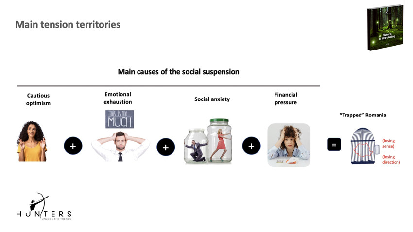 În ciuda acestor rezultate, noi am numit ediția Return to Storytelling / Reîntoarcerea la povestire. Asta pentru că știm și simțim că de fiecare dată când încrederea se prăbușește, când trendurile îngheață sau manifestă regres, când oamenii parchează optimismul și curajul, e foarte mare nevoie de comunicare, povestire și motivare. Picajul deschide zone mari de potențial de insight și învățăminte. Nu vreau să rostesc clasicul „criza este o oportunitate” pentru că Hunters spune mult mai mult de atât. Îți indică exact care sunt zonele de tensiune. Îți explică de ce anumite trenduri s-au prăbușit și cum poți face să le aduci înapoi unde erau. Îți contextualizează nevoia oamenilor de control, dar și nevoia intensă de libertate și felxibilitate. Este o criză emoțională și psihologică în primul rând. O mare criză de încredere.