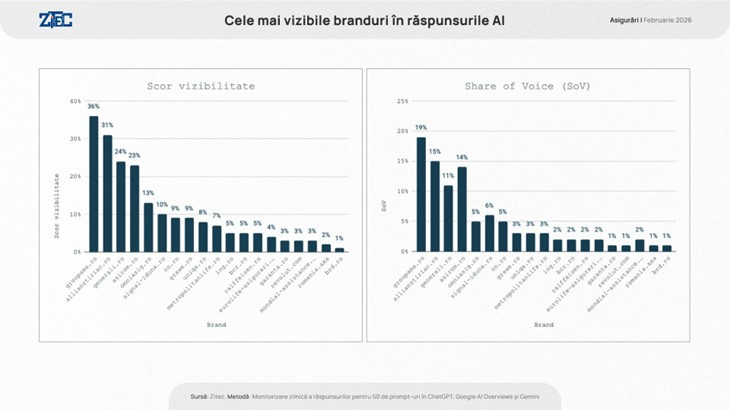 - Pe ChatGPT, allianztiriac.ro conduce clasamentul cu o vizibilitate de 34% , urmat de ro cu 26% și generali.ro cu 20%.