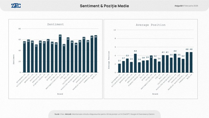Modelele AI descriu aceste branduri folosind un limbaj echilibrat și pozitiv, scorul mediu de Sentiment pentru lideri încadrându-se între 51 și 60 (pe o scară până la 100). În plus, când vine vorba de ordinea în care sunt listate în răspunsuri, groupama.ro și asirom.ro se bucură de o poziționare medie favorabilă, ocupând în general poziția 2.1, respectiv 2.5.