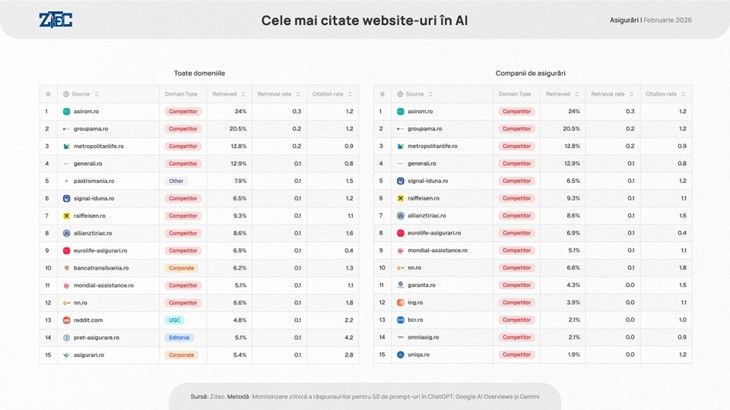 În luna februarie 2026, groupama.ro a condus clasamentul vizibilității în răspunsurile asistenților, înregistrând o vizibilitate generală de 36% și un Share of Voice de 19%. Podiumul este completat de allianztiriac.ro (vizibilitate 31%, SoV 15%) și generali.ro (vizibilitate 24%, SoV 11%). În top cinci se mai regăsesc asirom.ro, cu o vizibilitate de 23% (SoV 14%), și omniasig.ro, care atinge 13% (SoV 5%).