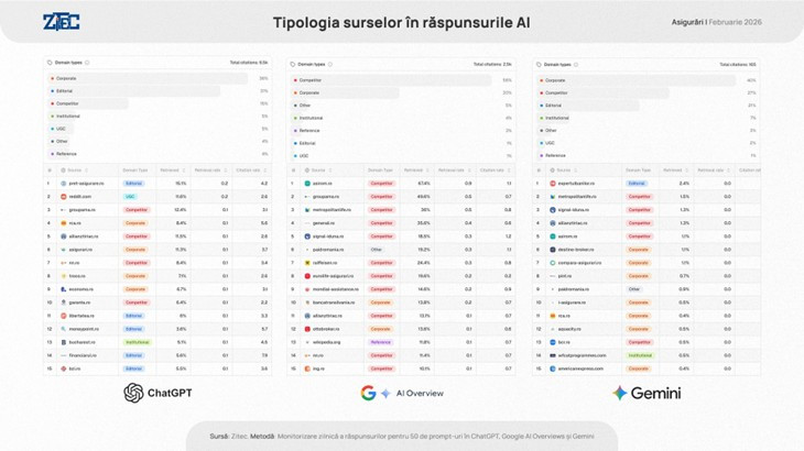 - ChatGPT folosește un mix diferit, extrăgând 36% din informații din platforme Corporate și 31% din surse Editoriale, în timp ce sursele Competitor reprezintă doar 15%.