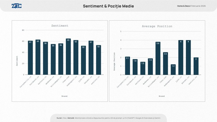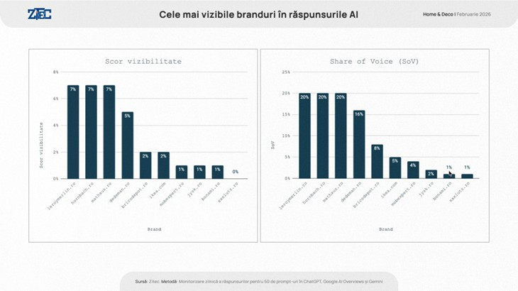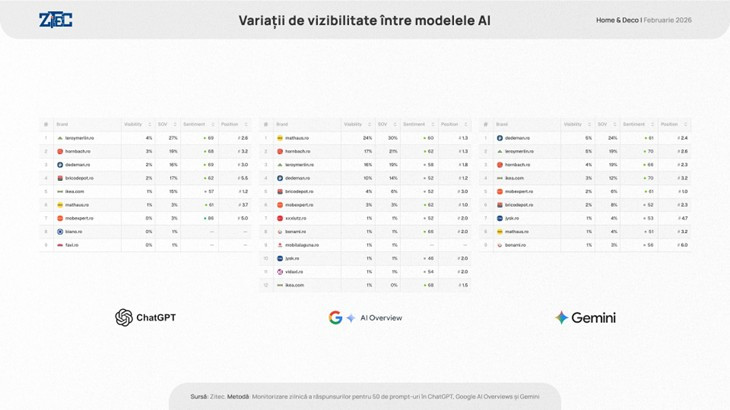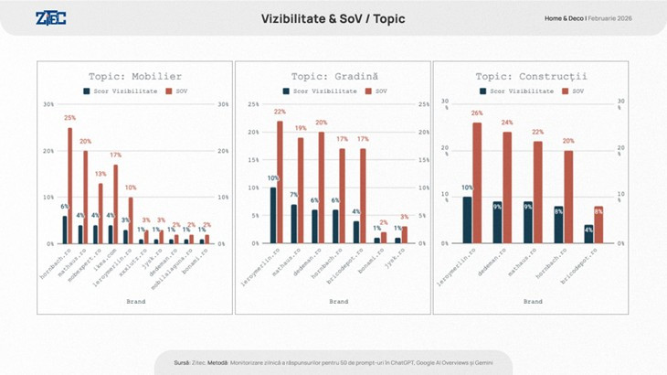 În luna februarie 2026, leroymerlin.ro, hornbach.ro çi mathaus.ro au condus clasamentul vizibilității în răspunsurile asistenților, fiecare înregistrând o vizibilitate generală de 7% și un Share of Voice de 20%. Clasamentul este continuat de dedeman.ro (vizibilitate 5%, SoV 16%) și bricodepot.ro (vizibilitate 2%, SoV 8%).