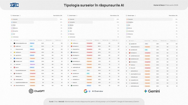 - ChatGPT extrage informații din platforme Corporate (55%) , dar se bazează puternic și pe surse Editoriale (27%), ignorând aproape complet site-urile Competitor (doar 4%). De asemenea, preferă surse precum homesandgardens.com (6.2%) și platforme UGC ca reddit.com (5.3%).
