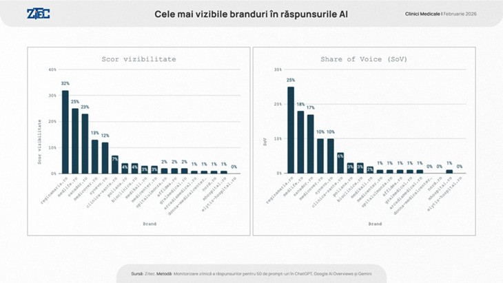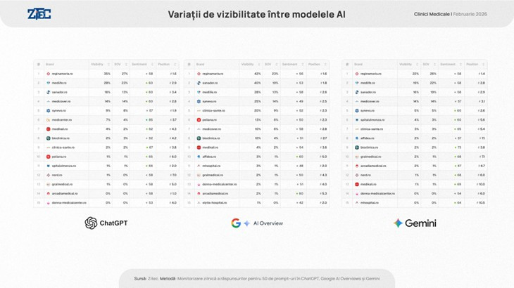 În luna februarie 2026, rețeaua Regina Maria (reginamaria.ro) a condus clasamentul vizibilității în răspunsurile asistenților, înregistrând o vizibilitate generală de 32% și un Share of Voice de 25%. Podiumul este completat de MedLife (vizibilitate 25%, SoV 18%) și Sanador (vizibilitate 23%, SoV 17%). În top 5 se mai regăsesc Medicover (vizibilitate 13%, SoV 10%) și laboratoarele Synevo (vizibilitate 12%, SoV 10%).