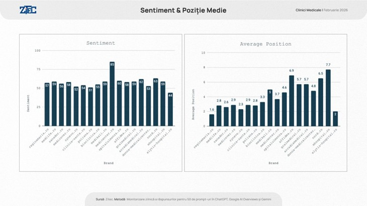 Sentimentul general asociat acestor mențiuni este unul neutru-pozitiv, specific limbajului factual din domeniul medical, liderii înregistrând scoruri între 52 (Synevo) și 59 (MedLife) pe o scară de la 0 la 100. În ceea ce privește Poziția medie în răspunsuri, Regina Maria excelează, ocupând adesea prima mențiune (poziția 1.6), urmată îndeaproape de Synevo (2.3) și Sanador (2.6).