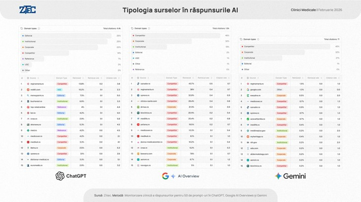 - Google AI Overviews este concentrat aproape exclusiv pe platformele liderilor din piață (surse Competitor). Extrage date din sanador.ro (43.7%), reginamaria.ro (38%) și synevo.ro (32.8%).