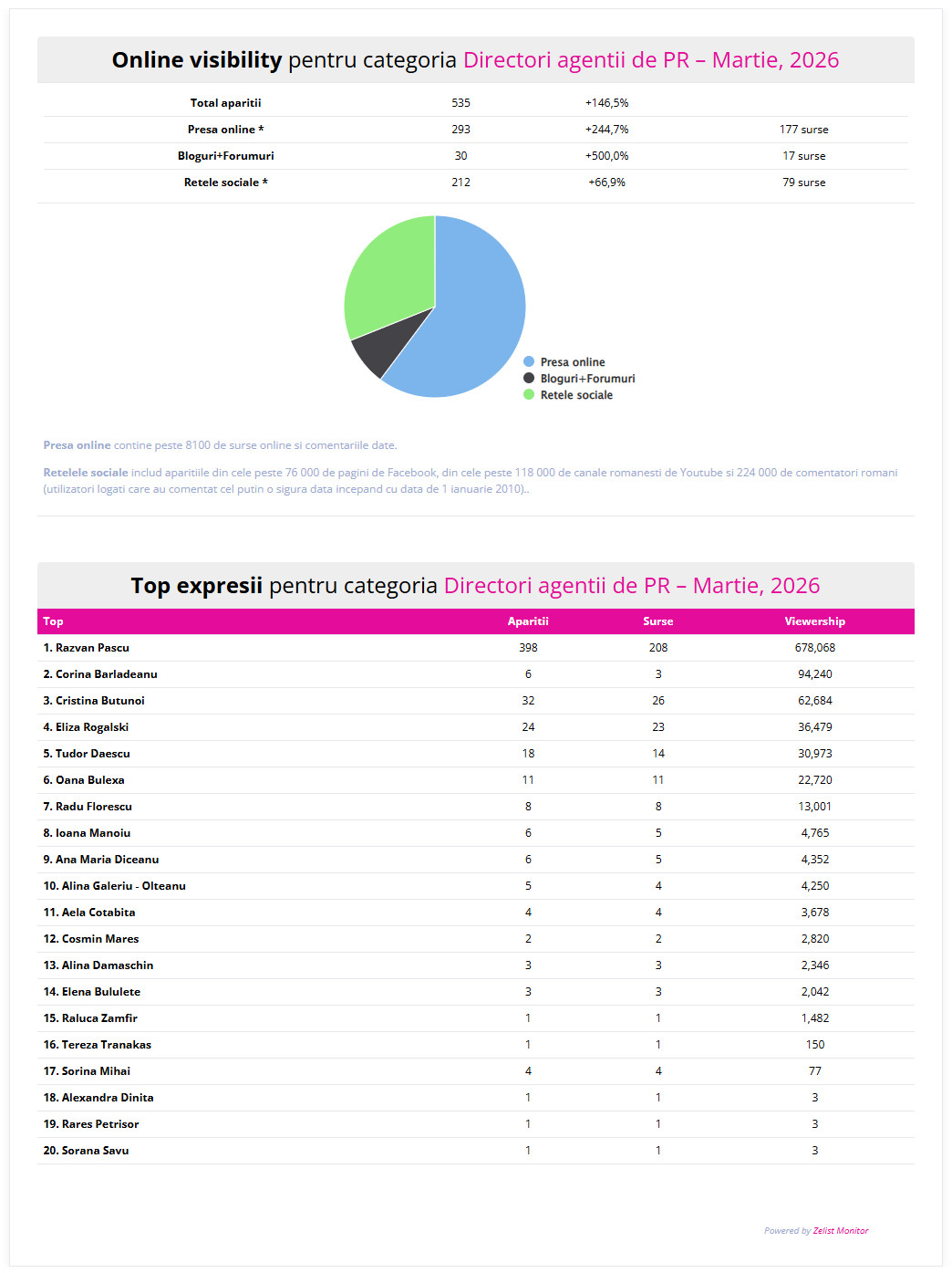 In topul celor mai vizibili directori ai agentiilor de PR in online si pe Facebook din martie efectuat de ZeList si publicat lunar de IQads, Razvan Pascu ocupa locul intai (678,068 de views). Pe locul al doilea se afla Corina Barladeanu (94,240 de views) dupa ce a urcat noua pozitii fata de luna precedenta, iar Cristina Butunoi (62,684 viewership) se afla pe locul al treilea.