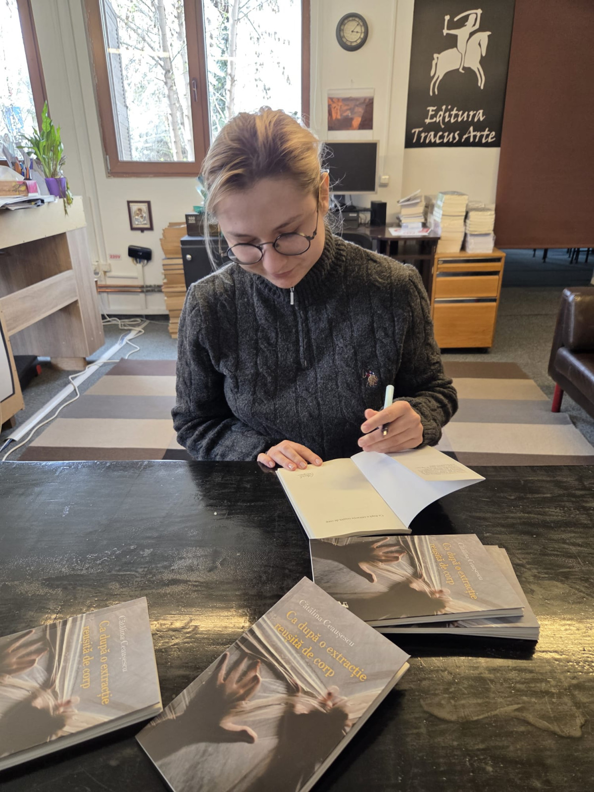 A debutat recent cu volumul „Ca după o extracție reușită de corp”, apărut în aprilie la Editura Tracus Arte. Titlul sună ca un moment medical și ca o eliberare în același timp, ceea ce probabil și este. O carte despre corp ca teritoriu, despre ce înseamnă să fii prezent în propriul corp, când meseria ta e să intri în corpul altcuiva.