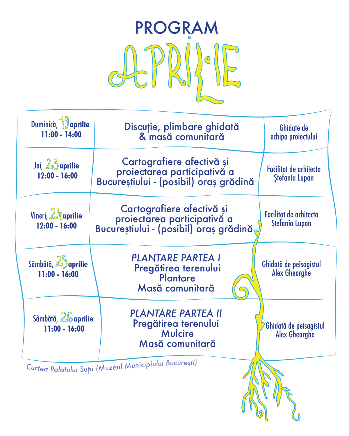În aprilie, mai și iunie 2026, publicul bucureștean este invitat să redescopere curtea Palatului Suțu și să o reimagineze ca posibilă grădină comunitară în centrul orașului, prin plimbări ghidate, mese comunitare, ateliere de cartografiere afectivă și proiectare participativă, urmate de acțiuni de plantare și îngrijire a grădinii.