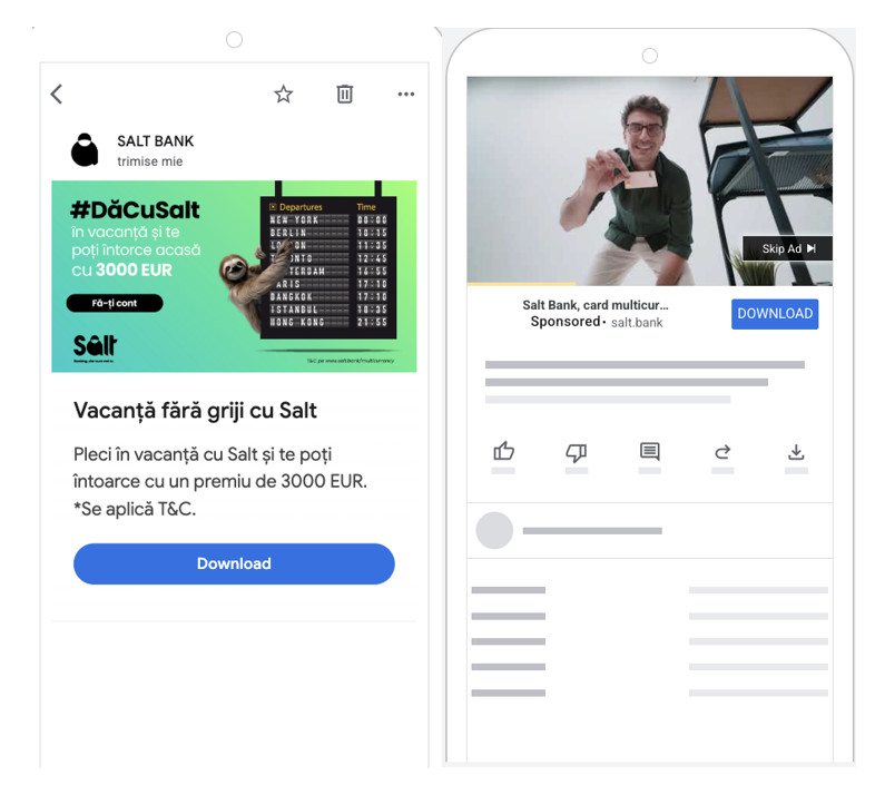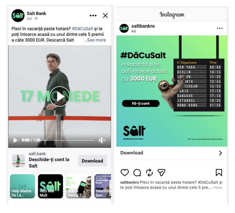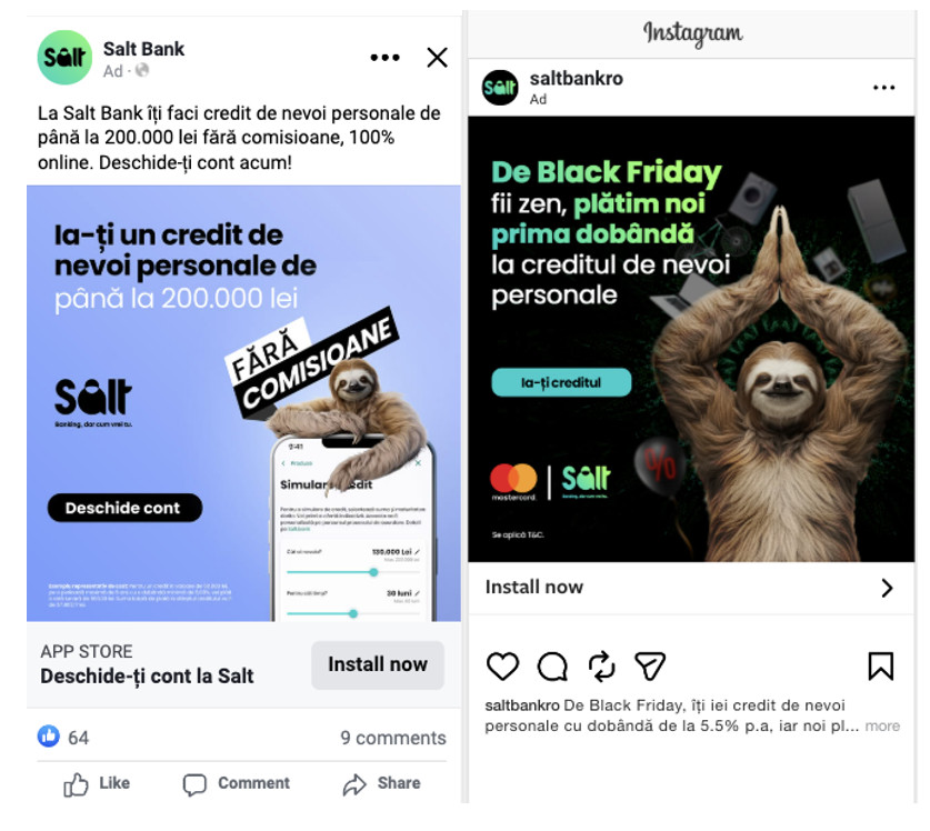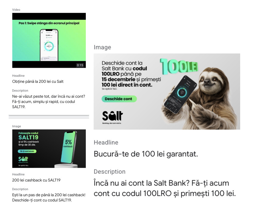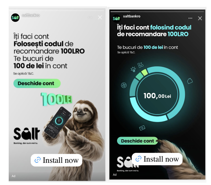 Pe parcursul anului, am promovat funcționalități precum Pay Bill, Subscription Manager, Automatic Saver, Road Assistance, Multicurrency, Help Mama, Depozite la termen, Credite de nevoi personale, Salt Business, dar și campanii cu cashback tip Member Get Member, cu cod de recomandare. Pentru fiecare funcționalitate, am testat mai multe versiuni creative, pentru a vedea ce mesaje și ce abordări funcționează cel mai bine pentru utilizatori.