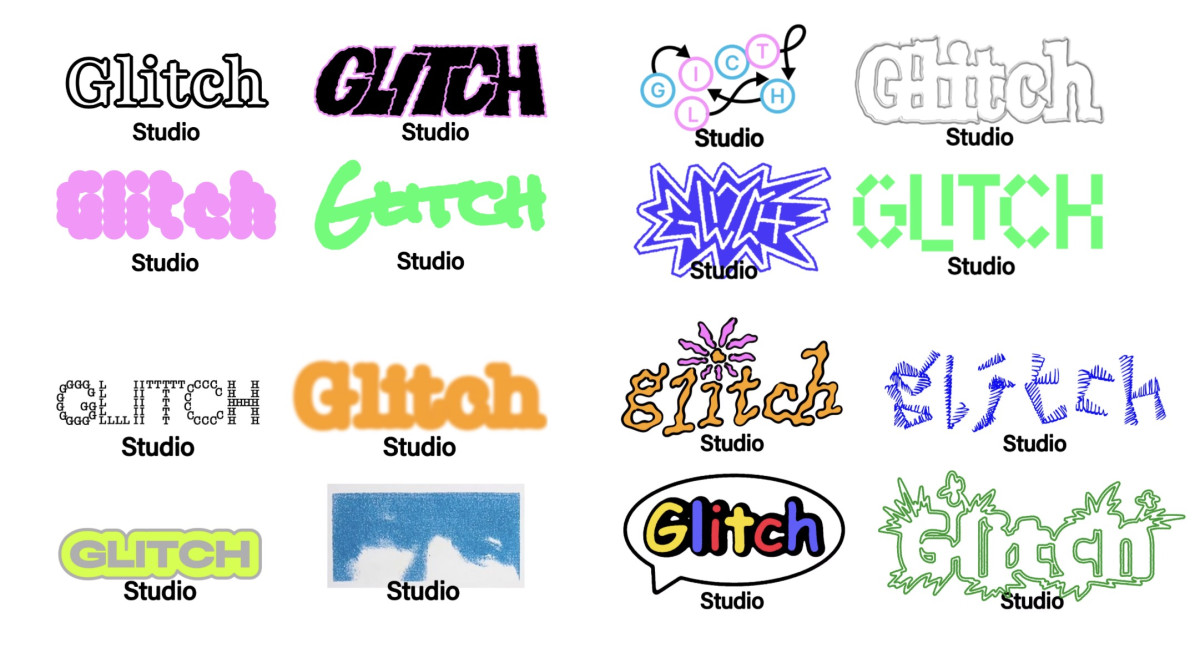 Un sample de câteva din logo-urile glitch chiar pe homepage glitch-shop.com în stânga sus, desenate de designerii glitch de vreo 2 ani încoace: Maria, Maria, Andrei, Ana, Vlad.