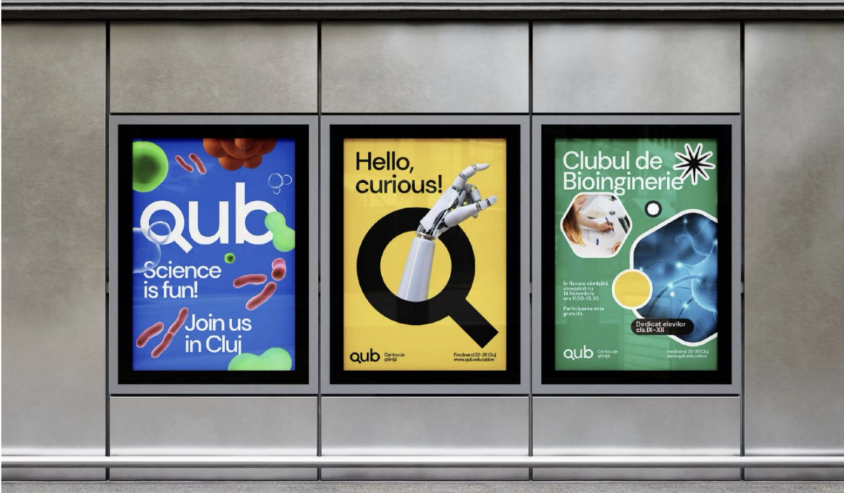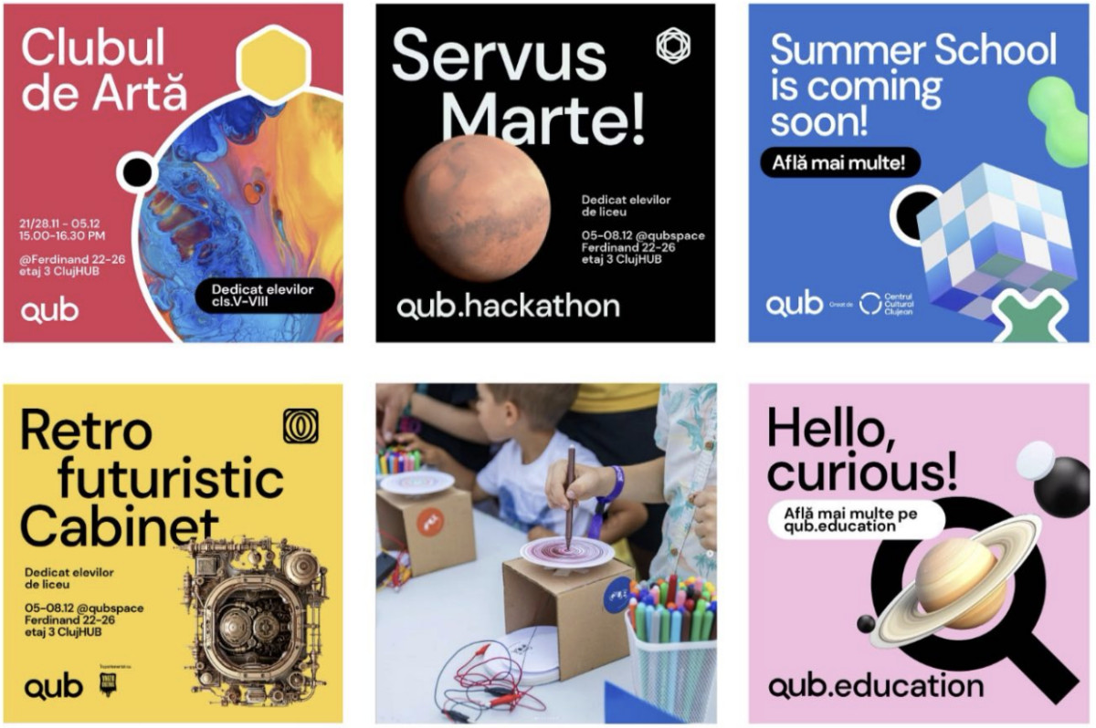 De exemplu, pentru QUB, centru de știință și artă din Cluj, am petrecut cel mai mult timp în procesul de strategie, săpând, discutând spre o esență - care a schimbat cu totul abordarea pe care am avut-o în procesul de identitate vizuală și verbală. Purpose/Scopul a fost cel care ne-a zis că QUB e mult mai mult decât credea că este - a fost deci un proces de soul searching acolo, parcurs alături de Irina Negrilă, strateg de brand, care s-a întâmplat la fel ca până acum, cu minți curioase punând întrebări.